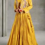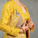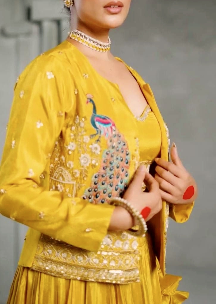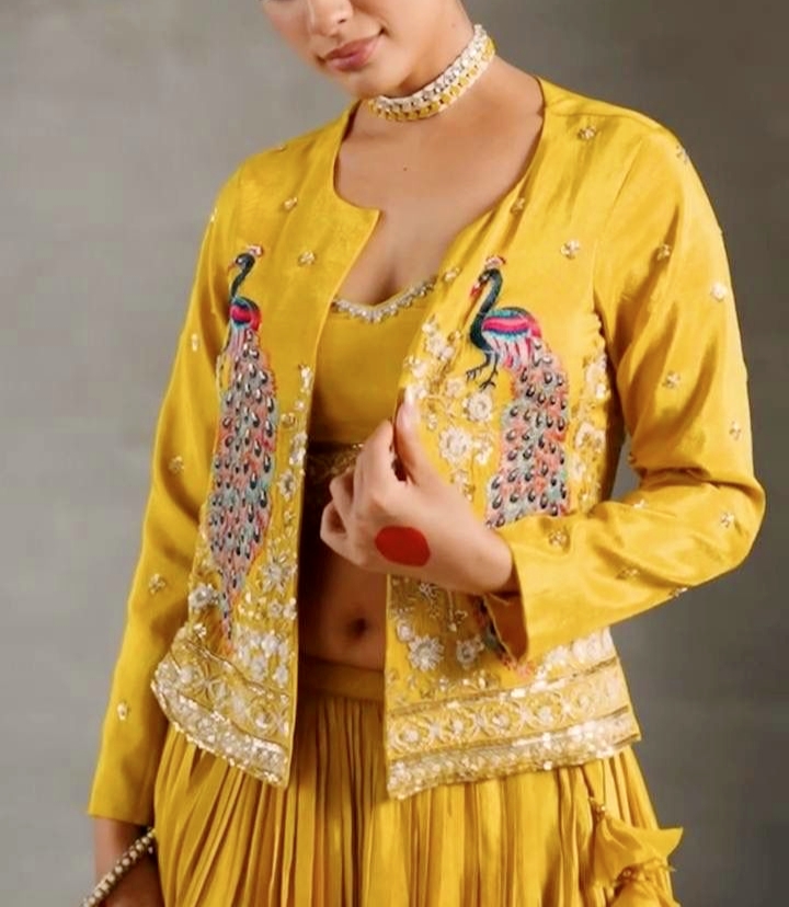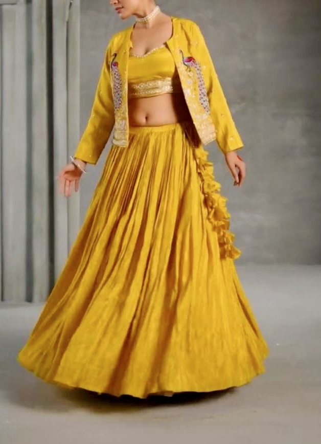 Exquisite Chinon Crop Top, Big Flair Lehenga & Embroidered Jacket Set – designed for statement festive elegance. Adorned with heavy thread & sequence work, beautifully tailored with premium finishing.