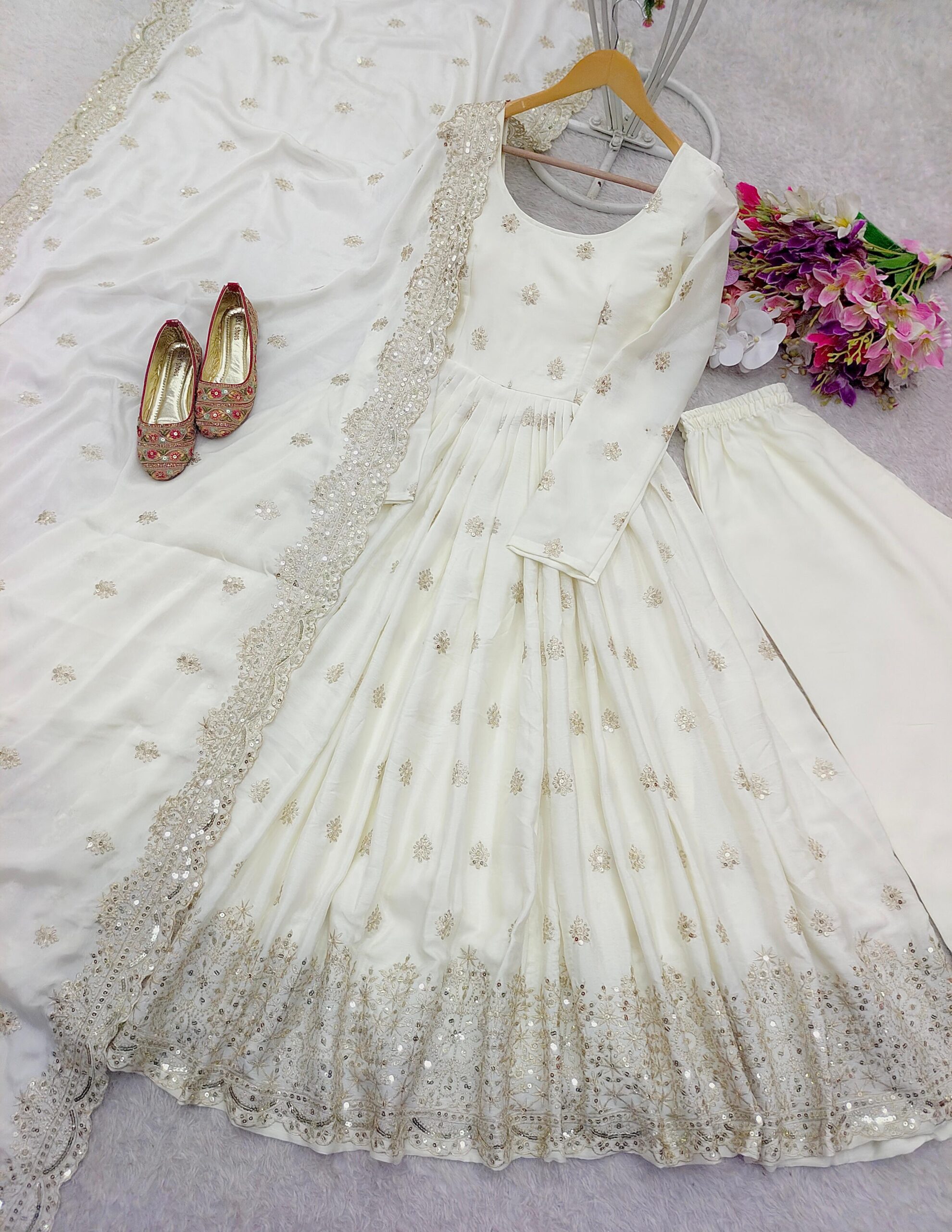 Draped in luxurious Chinon silk and adorned with intricate embroidery & shimmering sequence work, this dreamy gown set is made for moments that matter.