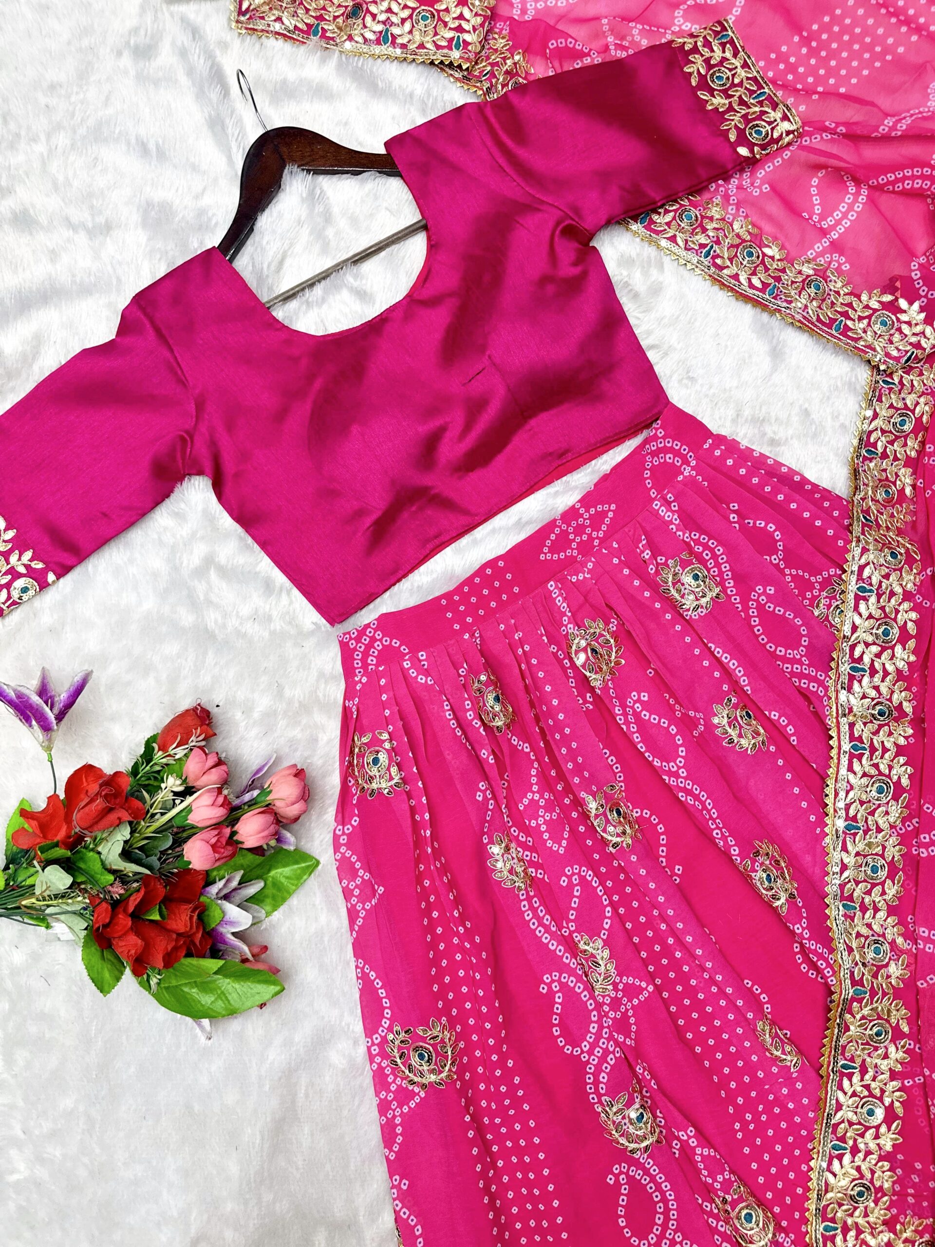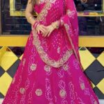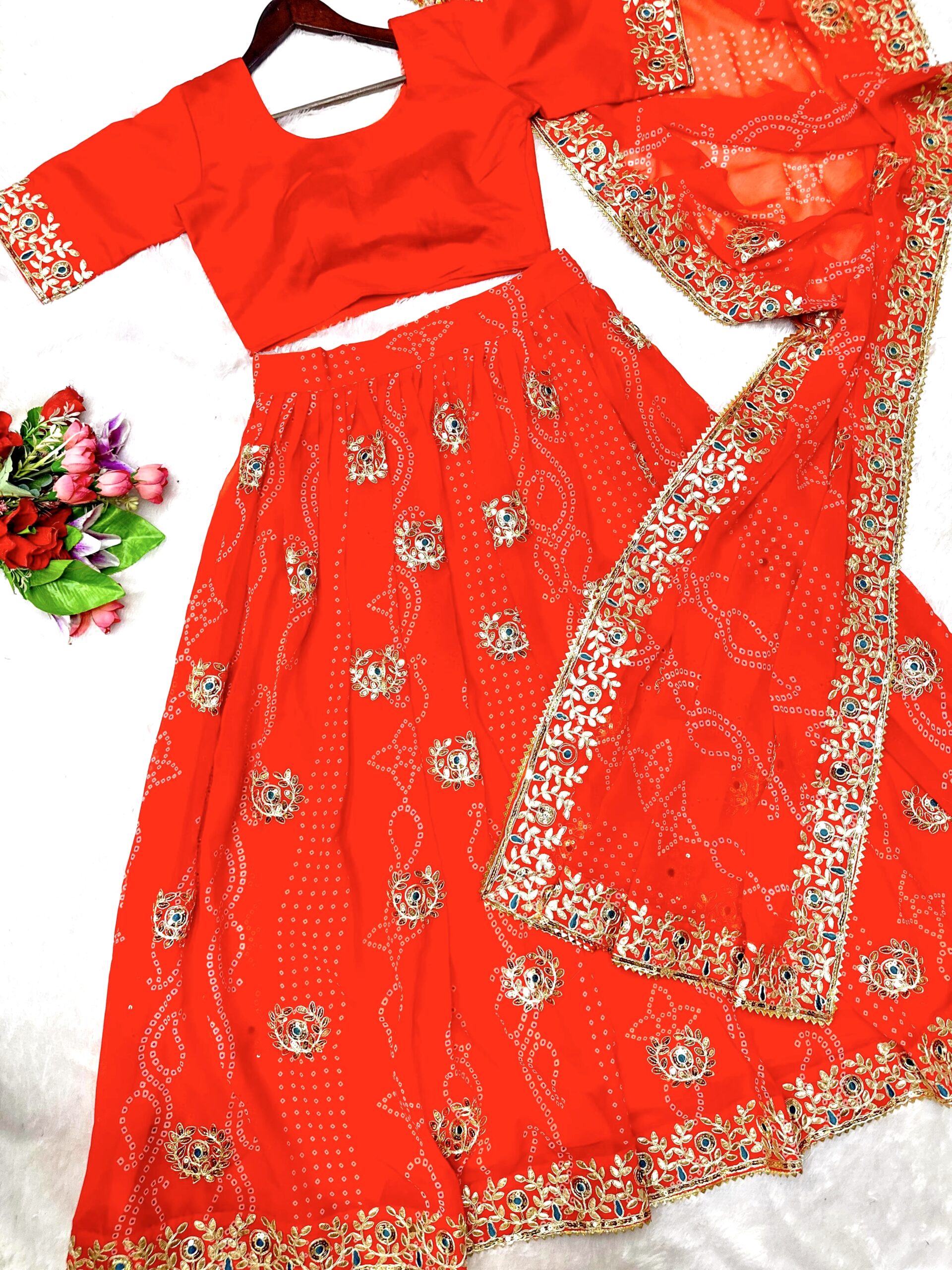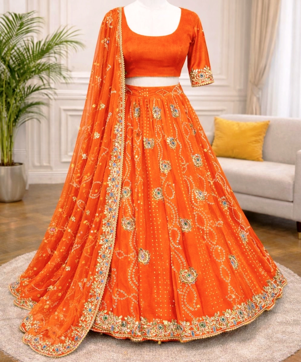 Grace meets grandeur in this premium georgette lehenga featuring rich digital Badhani print with exquisite embroidery gotta patti work. Designed with a stunning 4-meter flair for a royal silhouette.