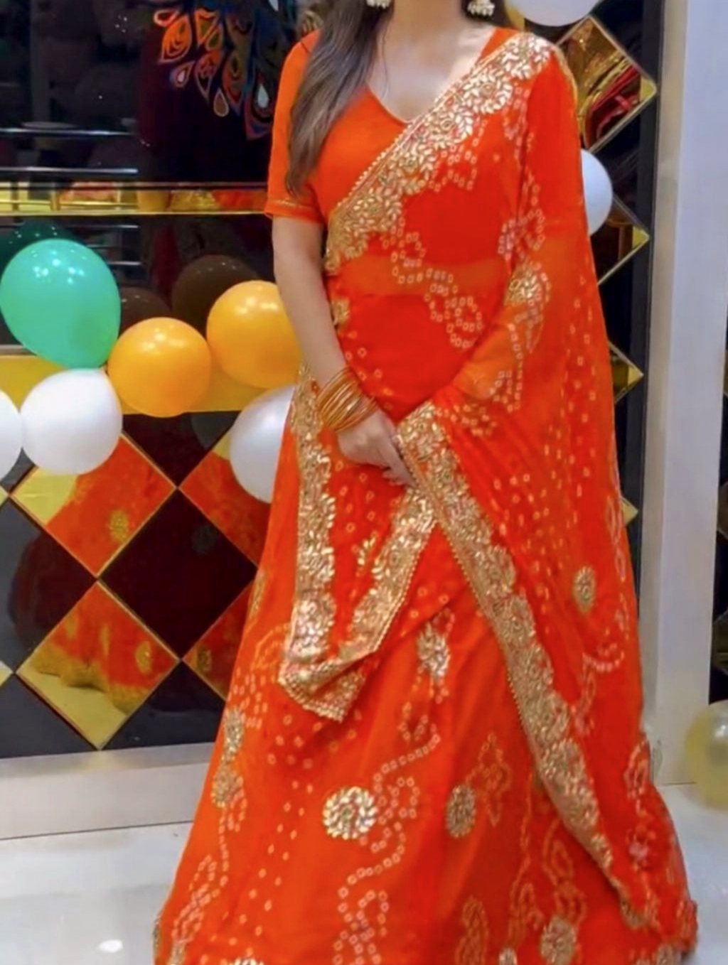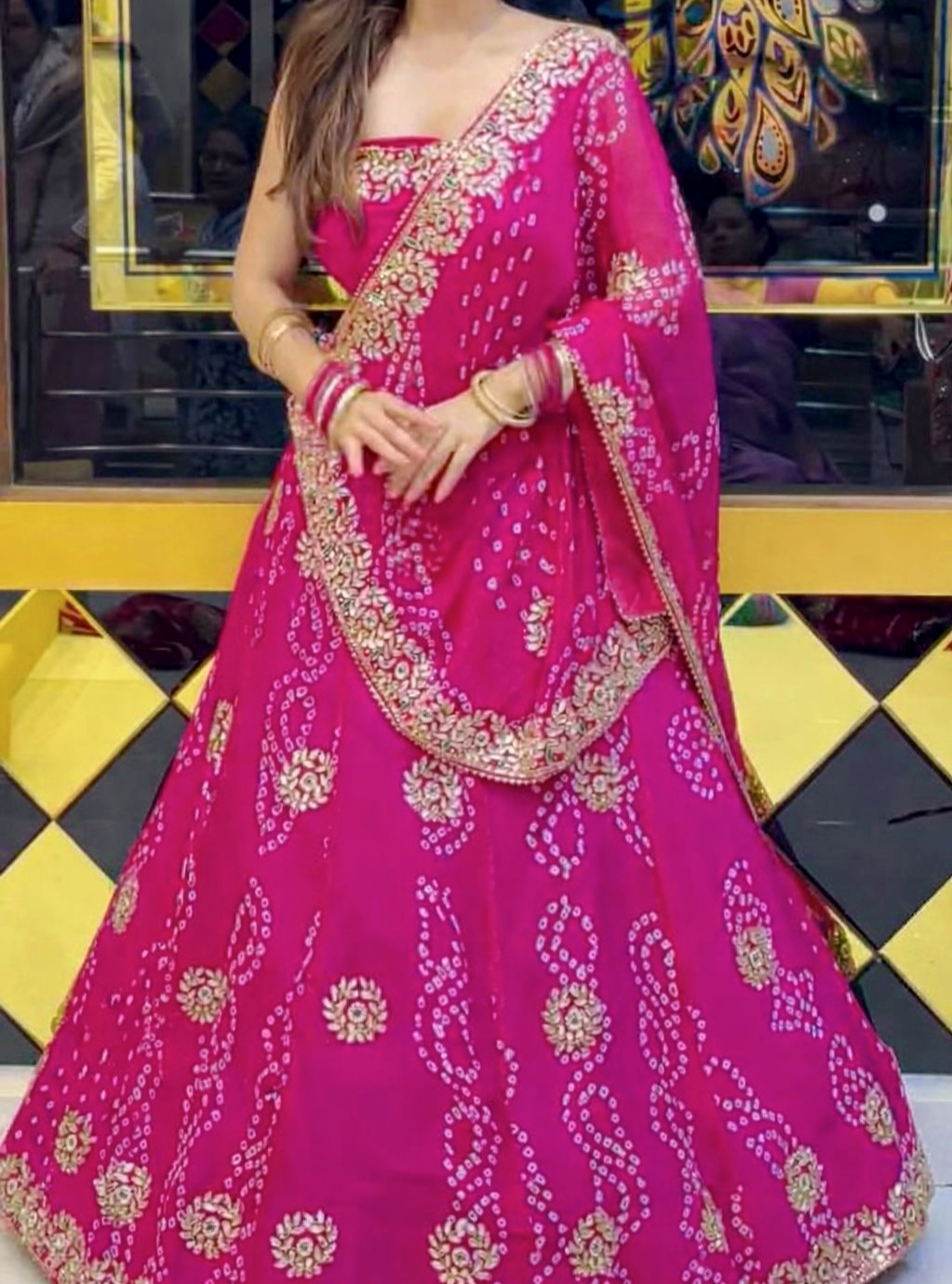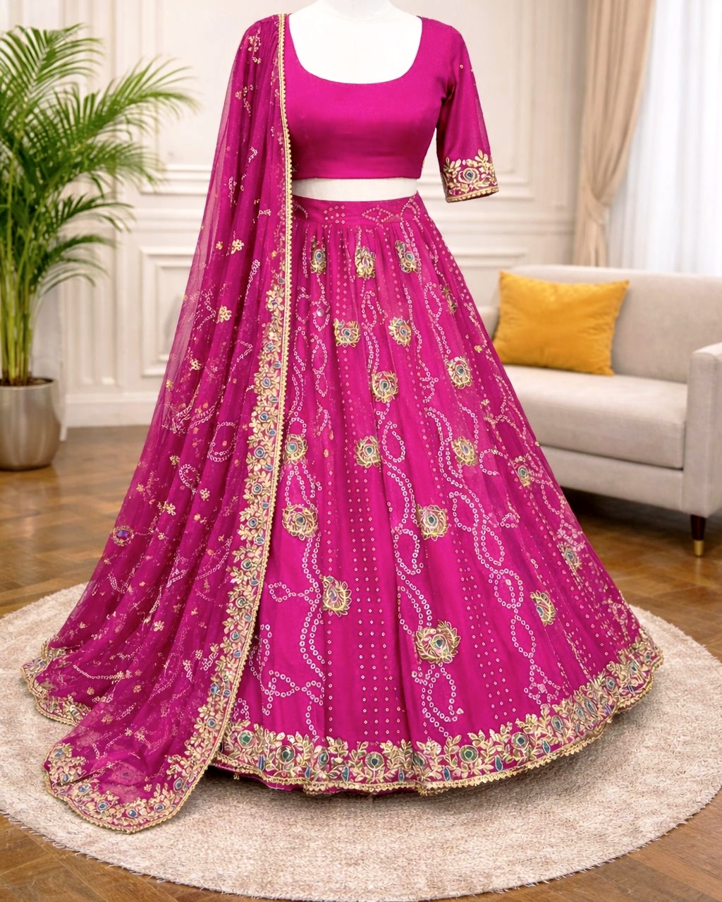 Grace meets grandeur in this premium georgette lehenga featuring rich digital Badhani print with exquisite embroidery gotta patti work. Designed with a stunning 4-meter flair for a royal silhouette.
