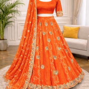 Drape yourself in this luxuriously embroidered lehenga choli, crafted from rich Vichitra silk and adorned with dazzling 7mm sequence work that sparkles with every step.
