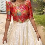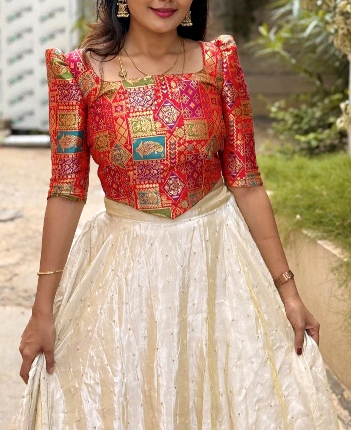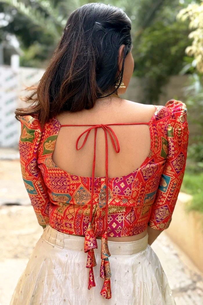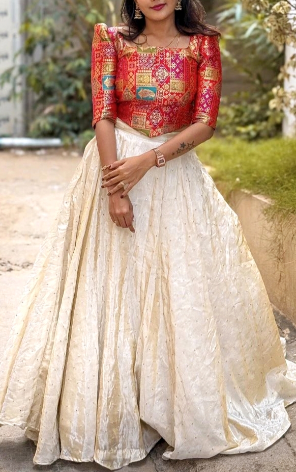 The rich jacquard blouse harmonizes with the ethereal Chinon silk lehenga, creating a silhouette that floats effortlessly while commanding attention.