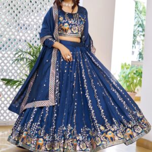 Drape yourself in this luxuriously embroidered lehenga choli, crafted from rich Vichitra silk and adorned with dazzling 7mm sequence work that sparkles with every step.