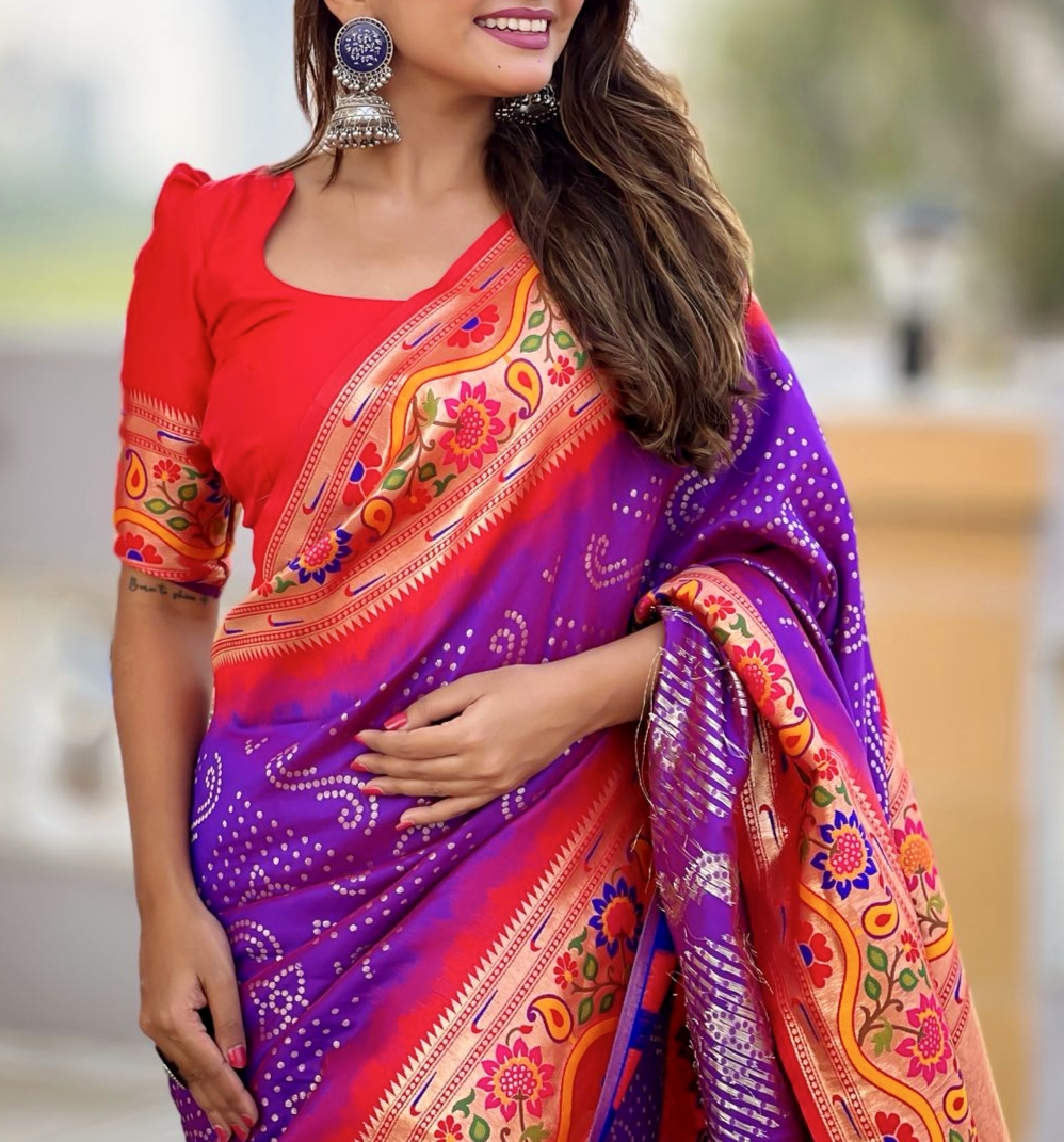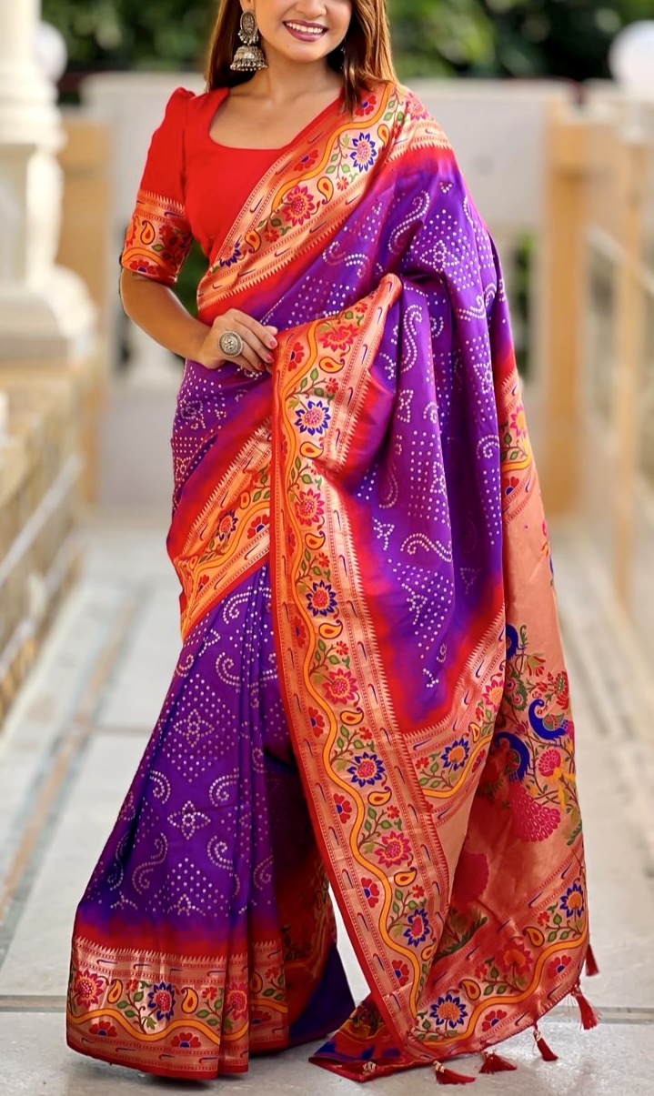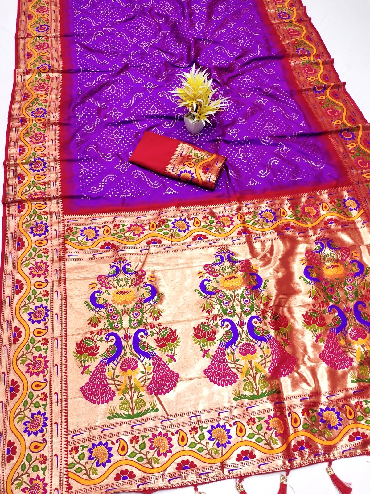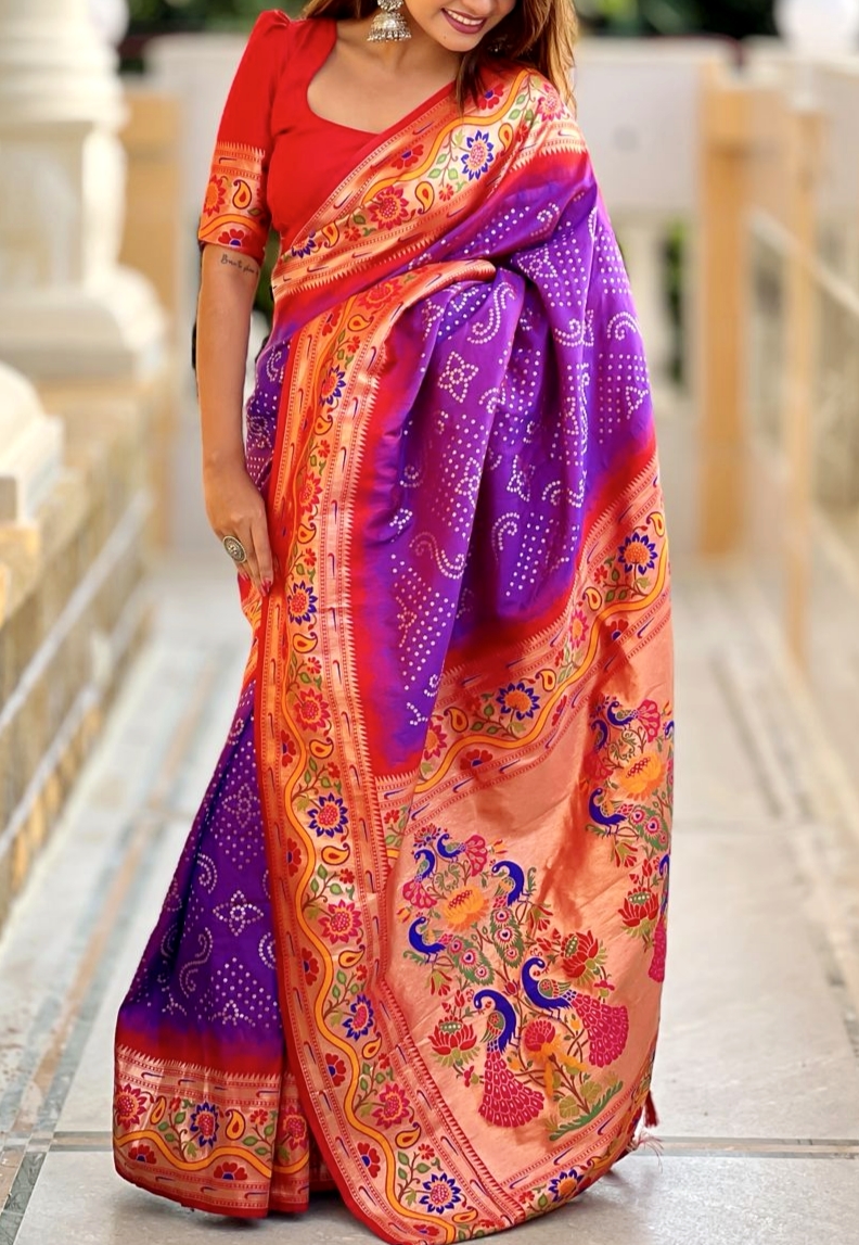 Drape yourself in timeless elegance with this stunning Soft Paithani Silk Saree beautifully crafted with intricate Bandhani weaving design all over.
