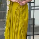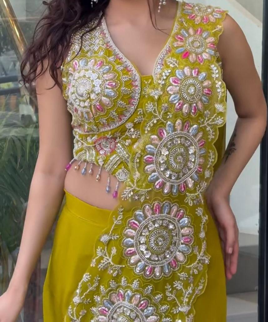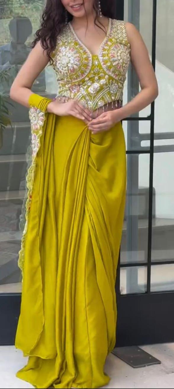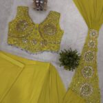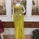 Turn every entrance into a statement with our stunning ready-to-wear drape saree crafted in a dreamy faux georgette and adorned with intricate embroidery & shimmering sequins.