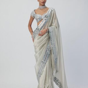 Turn every entrance into a statement with our stunning ready-to-wear drape saree crafted in a dreamy faux georgette and adorned with intricate embroidery & shimmering sequins.