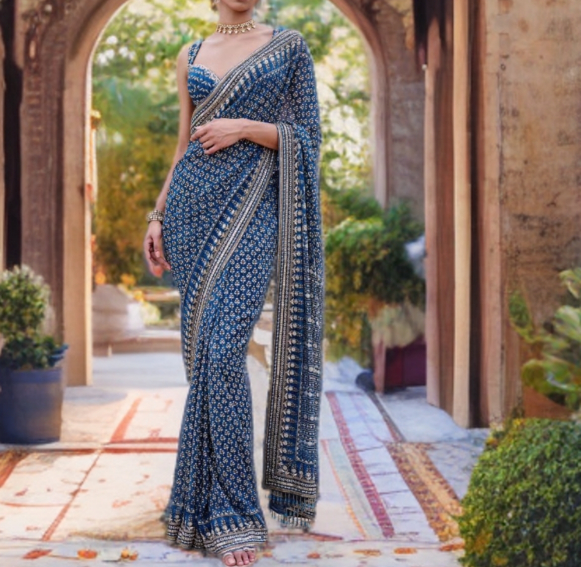 The true beauty of this saree lies in its intricate handcrafted embellishments that add a luxurious, festive glow to your look. Perfect for weddings, parties, and special occasions.