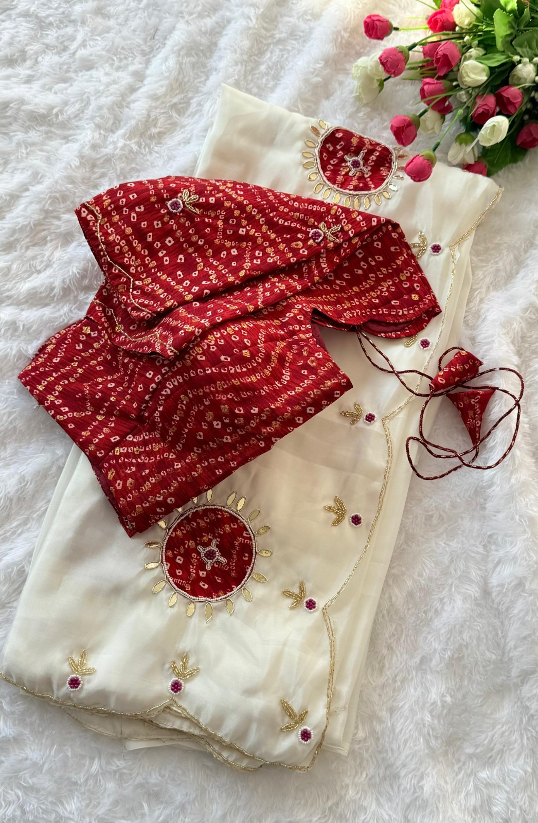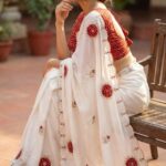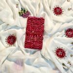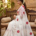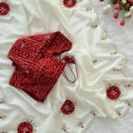 The look is elevated with a finely hand-worked border adorned with beads and moti, adding rich artisanal charm.