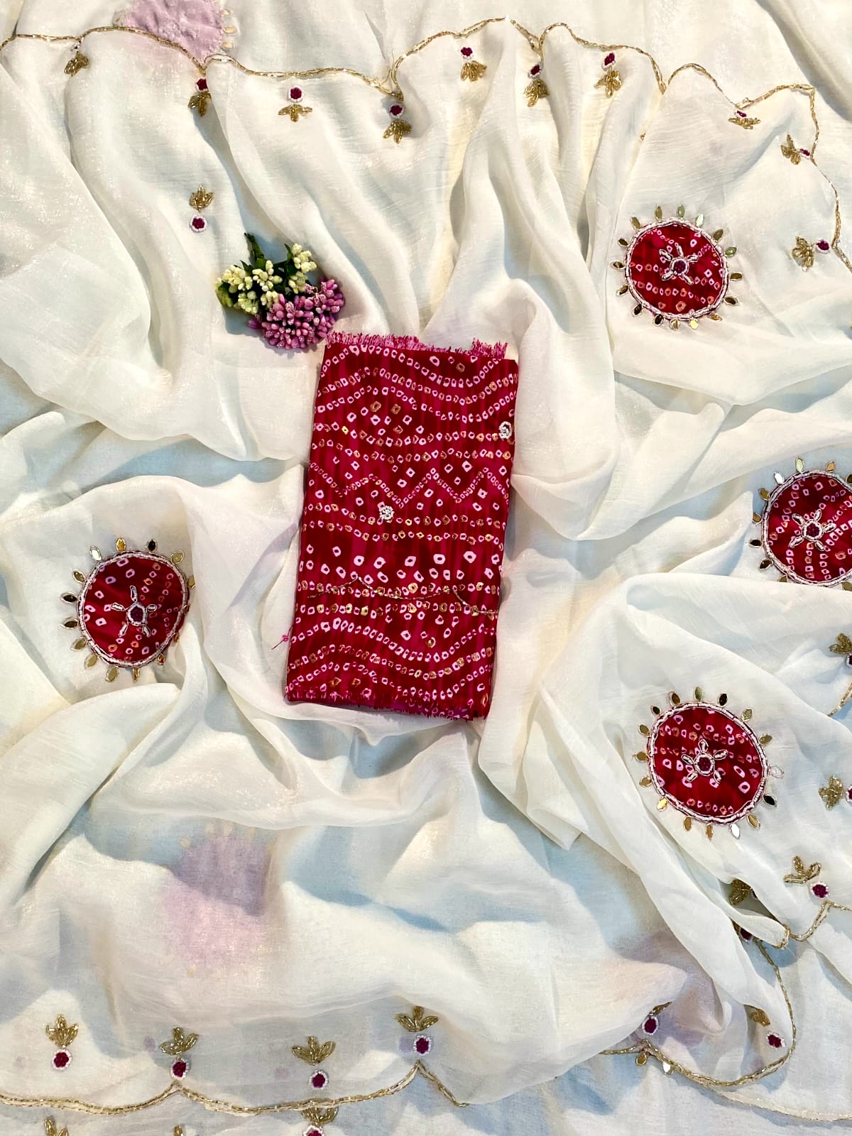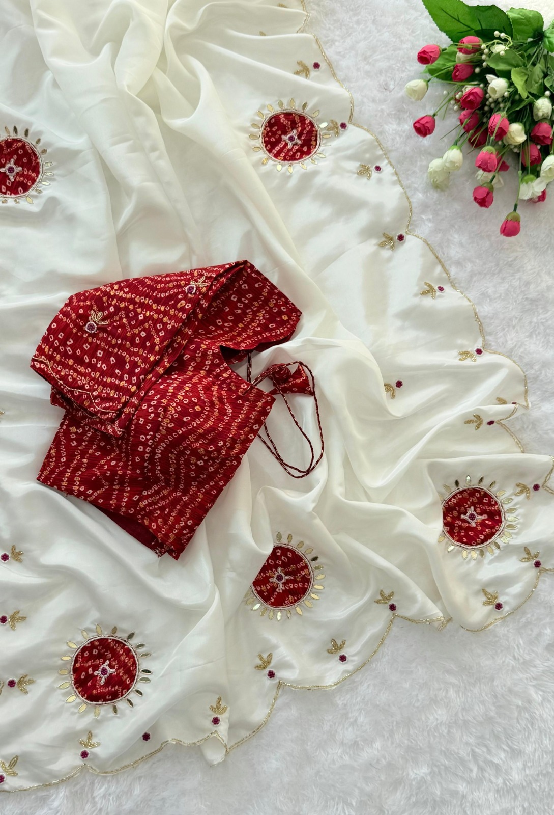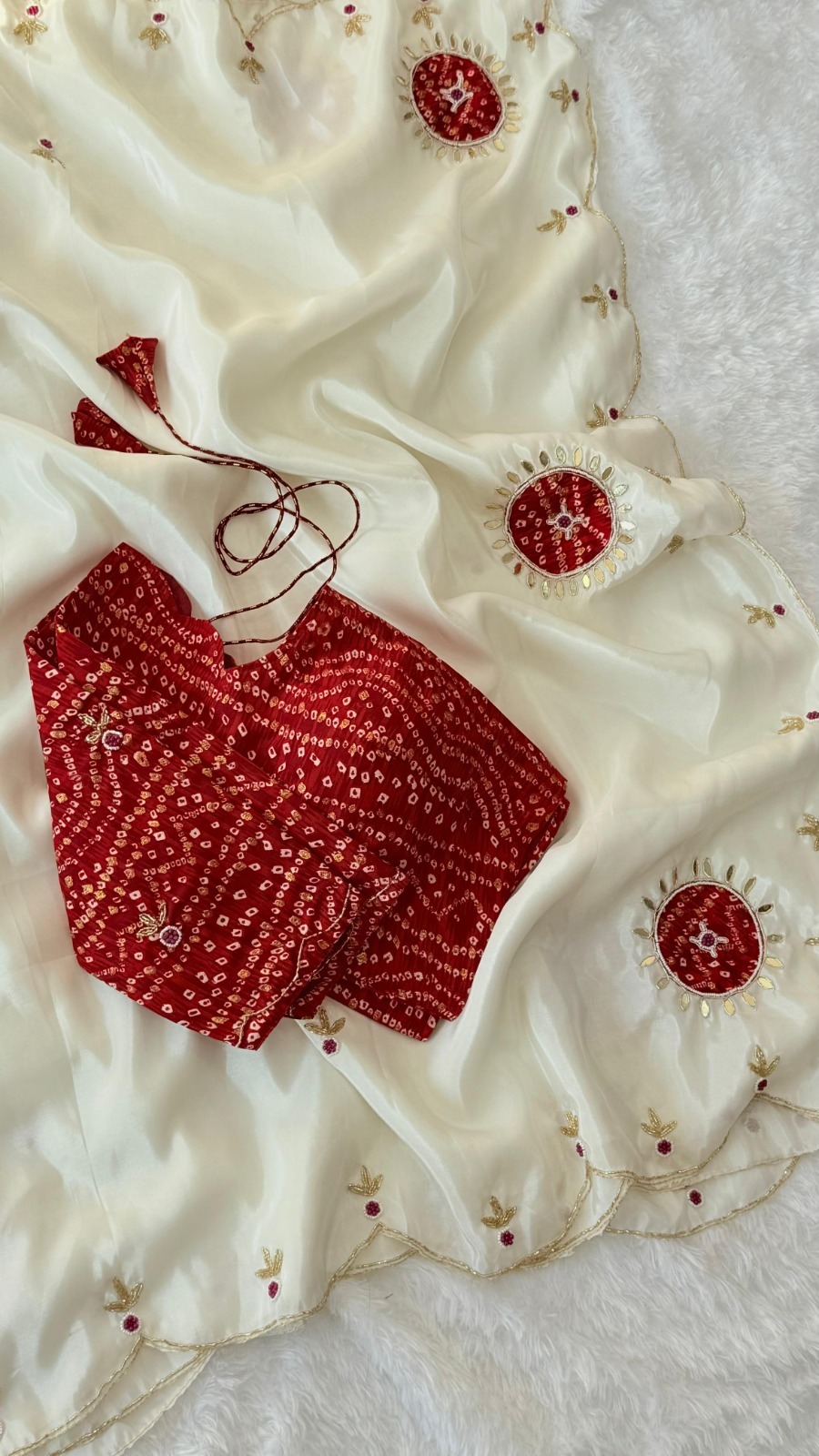 A graceful saree in crunchy fabric, enhanced with exquisite patch butta and delicate leaf-shaped mirror buttis scattered all over.