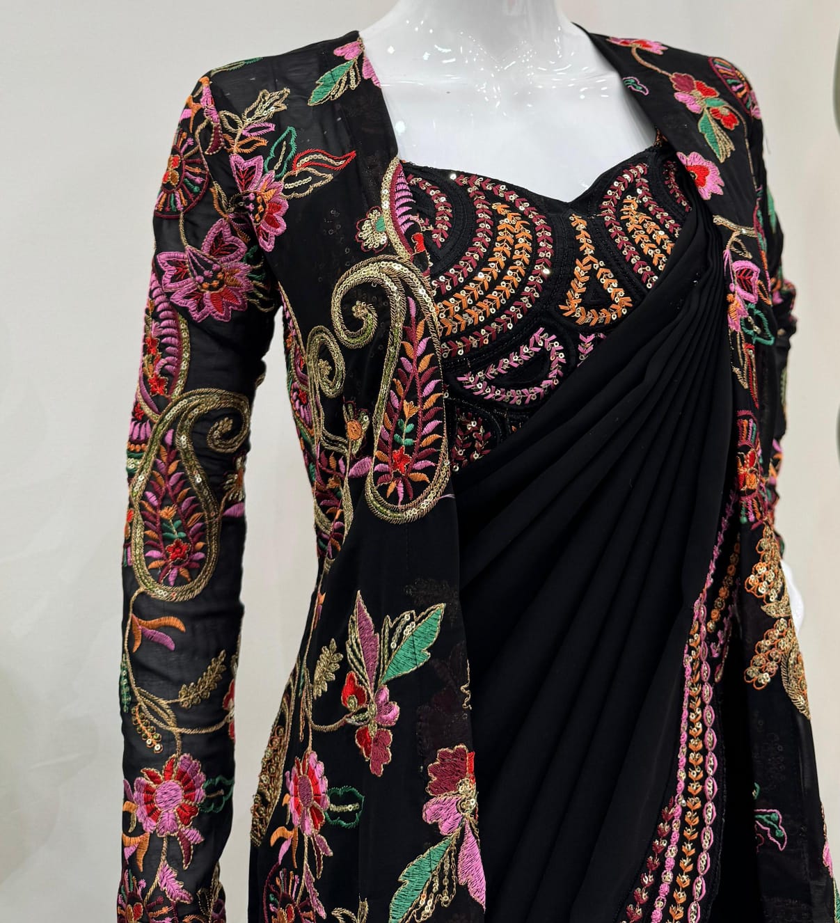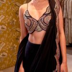 Style: Versatile shrug — can be worn over the saree for added drama or styled separately for mix-and-match options.
