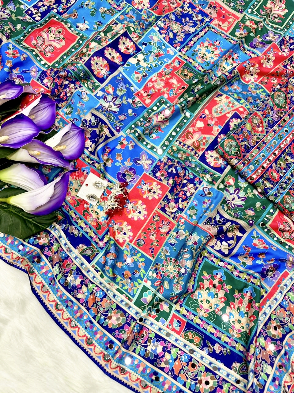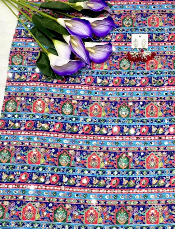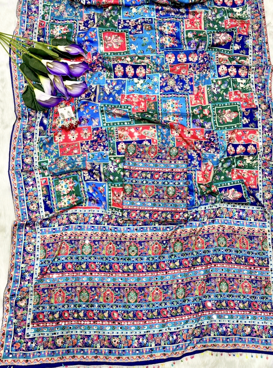 Drape yourself in elegance with this stunning digital print saree, enhanced with real mirror work and a chic latkan pallu. Crafted in premium crepe silk for a graceful, luxurious look.Β