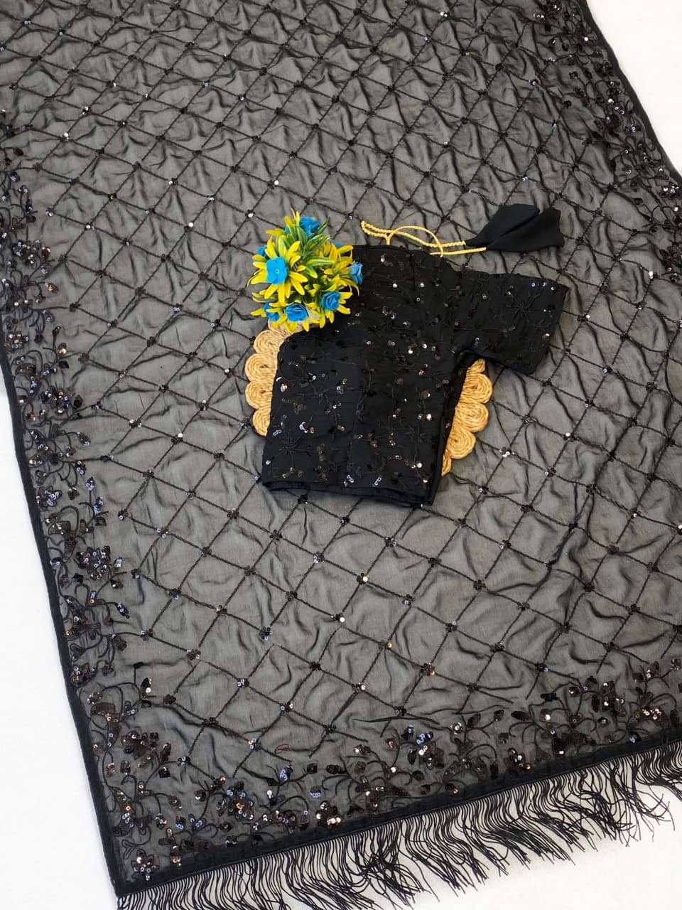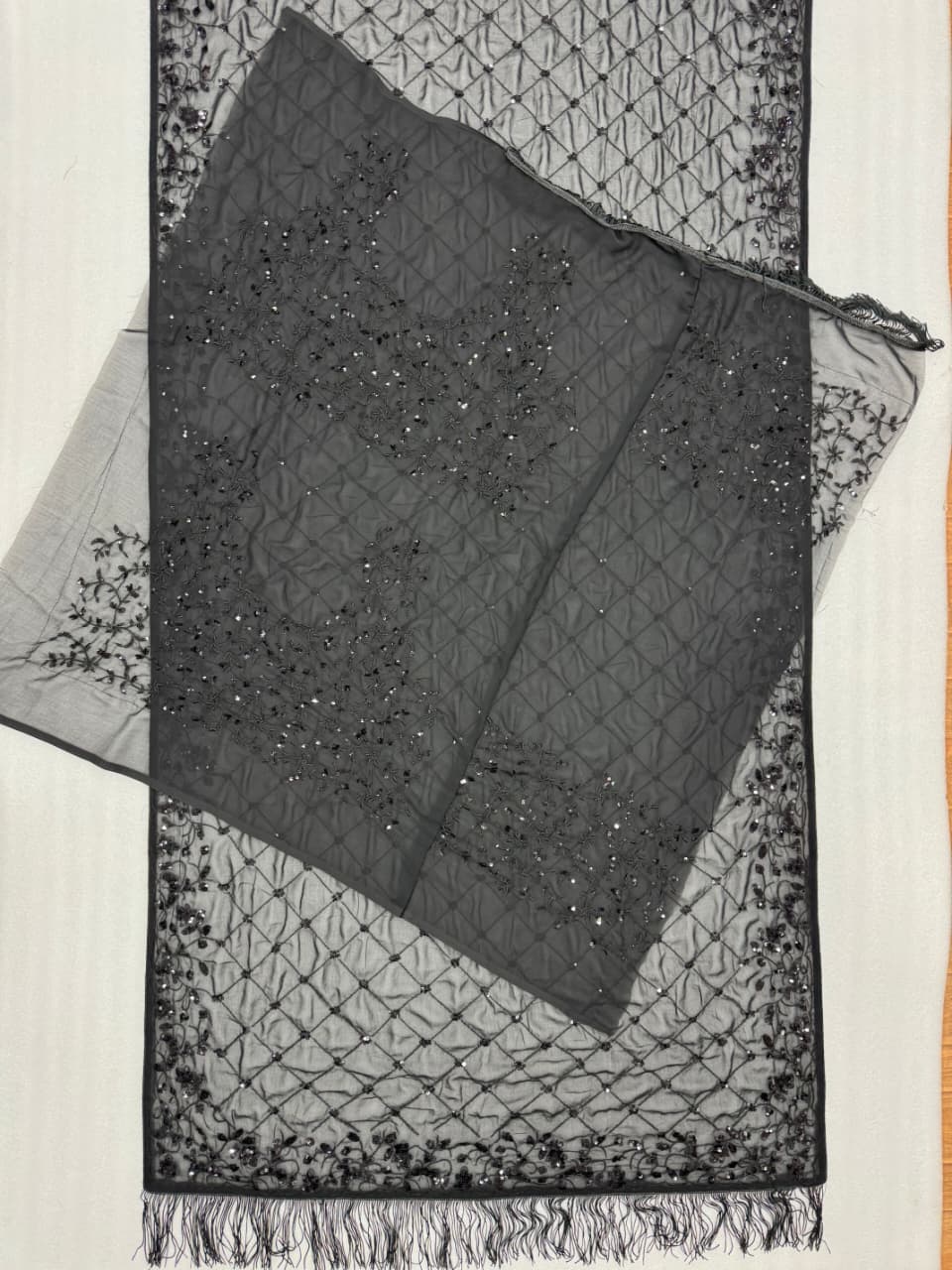 Pure elegance in premium faux georgette, adorned with rich sequin & embroidery work. Comes with a heavily embroidered unstitched blouse and designer tassel detailing.