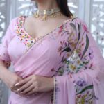 Tabby Silk Saree adorned with beautiful floral prints, intricate cutdana and sequin handwork all over. Features an exquisite cutwork hand-embroidered border for that perfect touch of elegance.