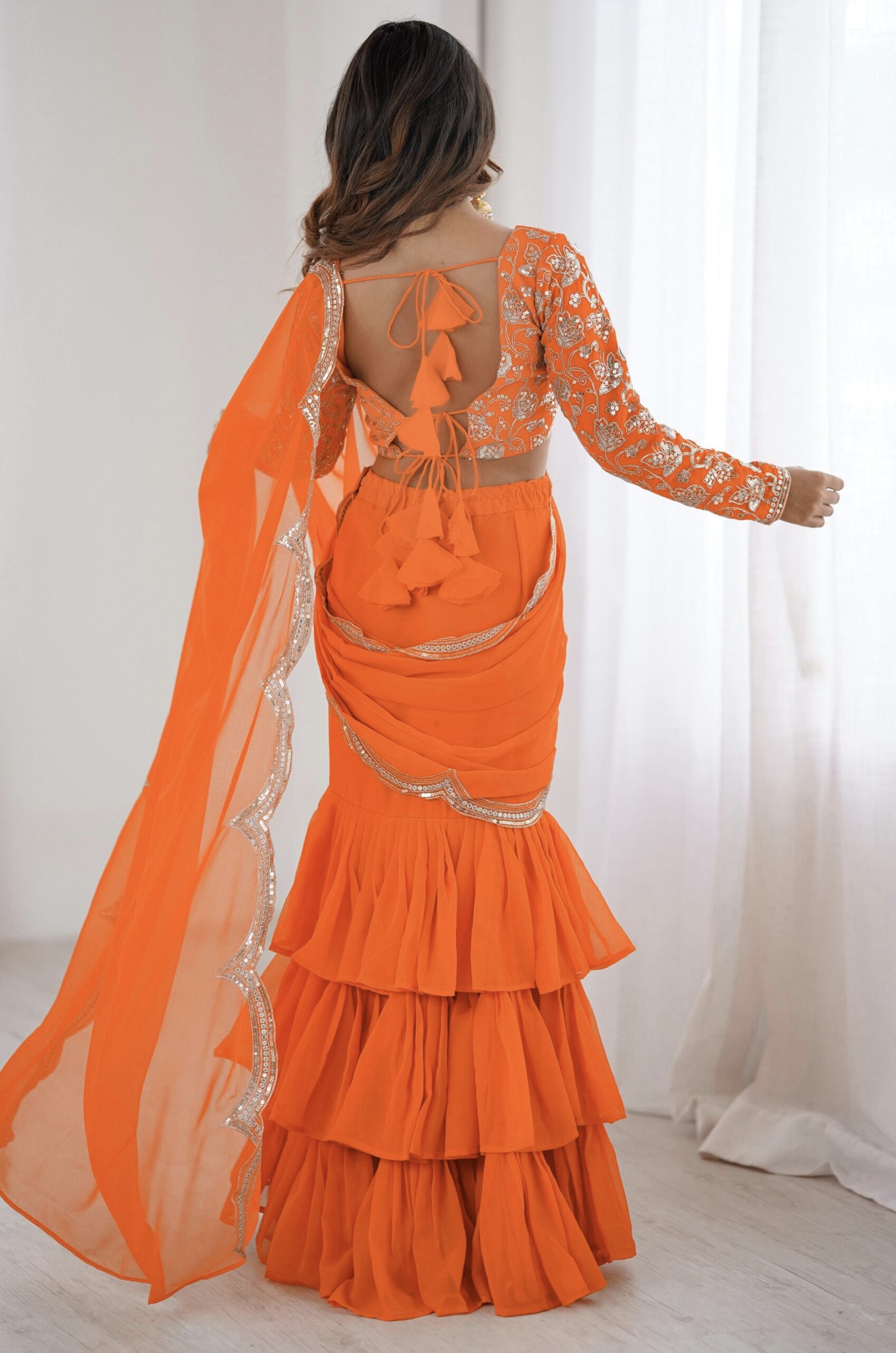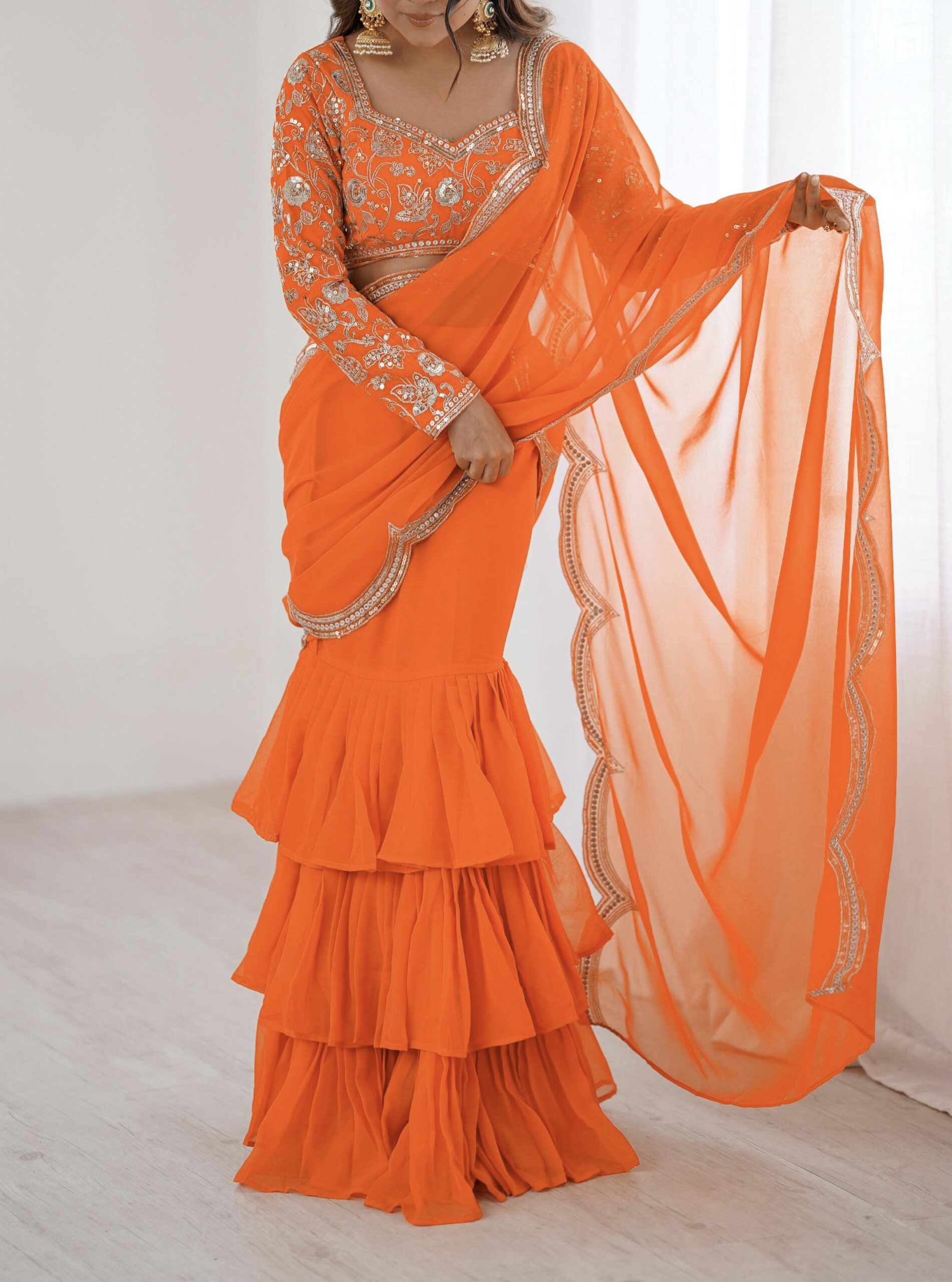 Turn heads in this dazzling designer saree, crafted with love. Effortlessly elegant and irresistibly glamorous, this saree is made to make you shine.