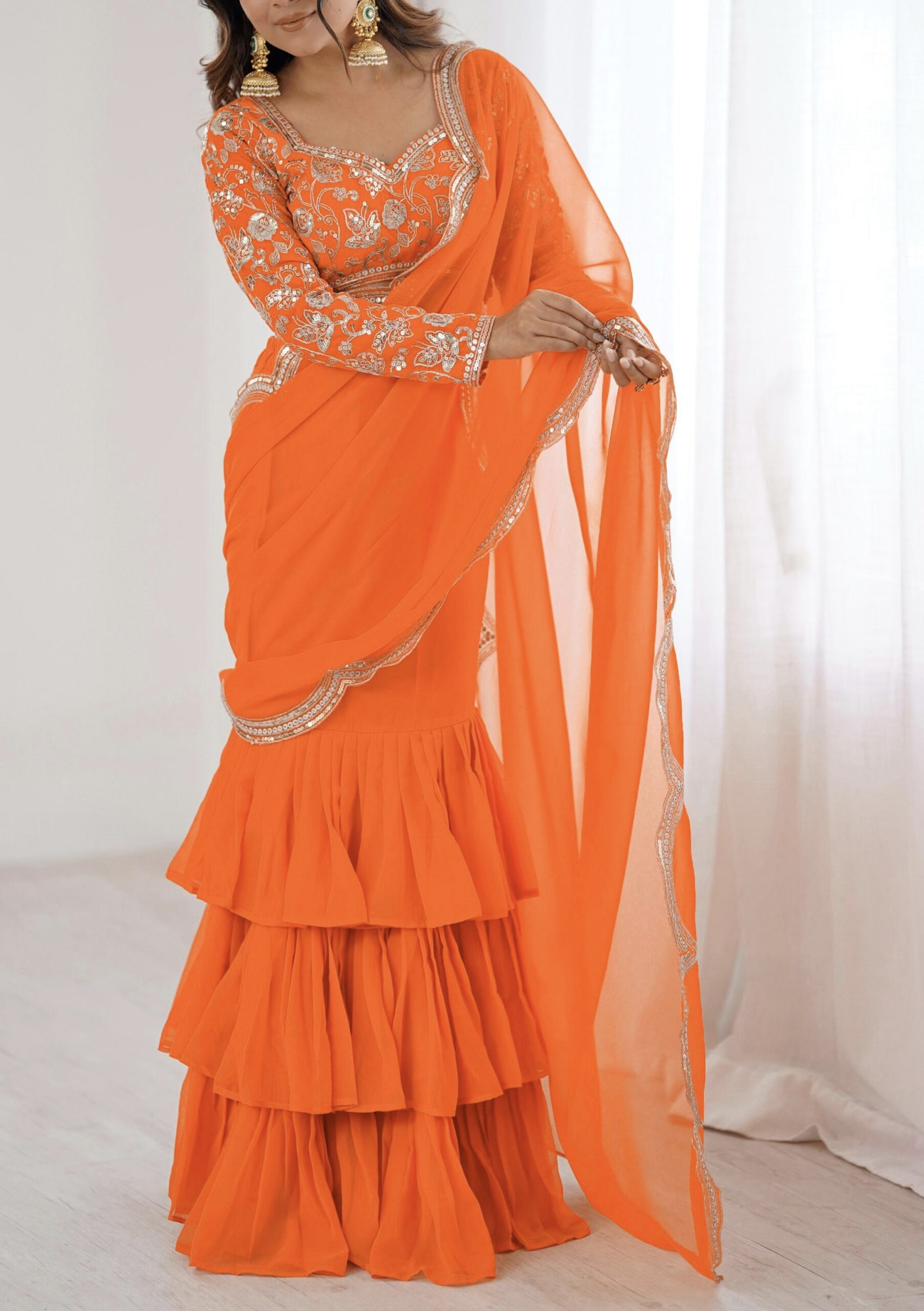 Blouse Details:• Fabric: Faux Georgette with Inner Lining• Work: Elegant Thread & Sequin Embroidery• Cut: 1 Meter | Unstitched | Customizable to your size