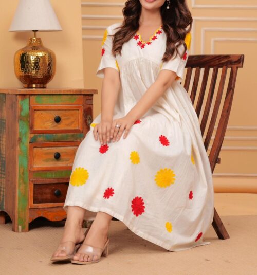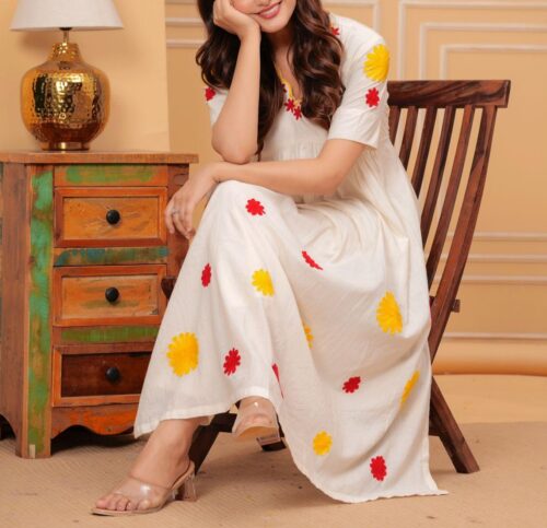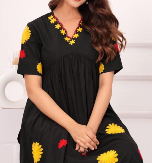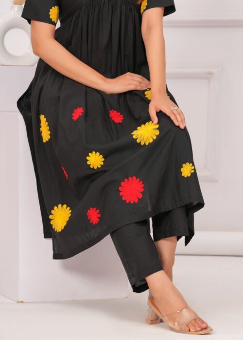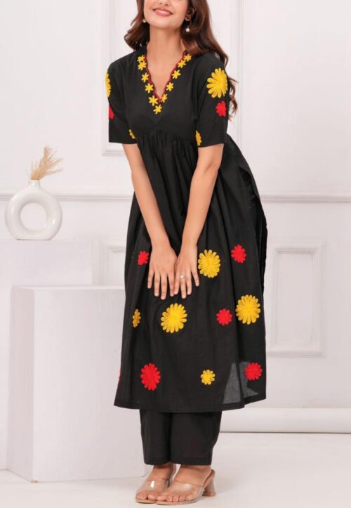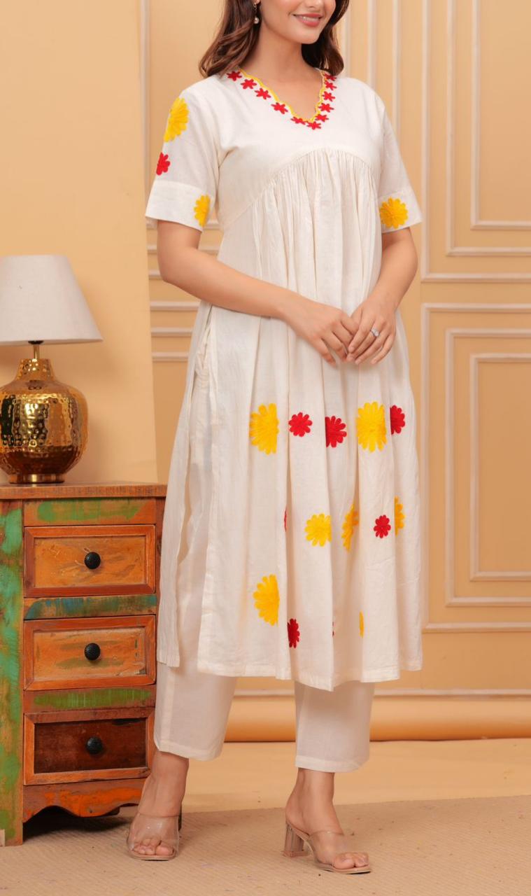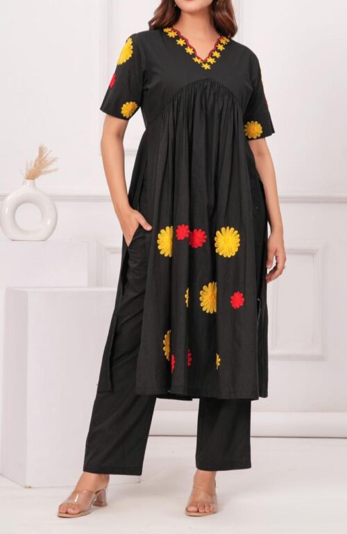 Brighten up your wardrobe with this fresh and versatile set . The kurti features cheerful floral embroidery that adds a playful touch, while the relaxed-fit pants complete the look with understated elegance. Perfect for casual outings, work, or weekend get-togethers.