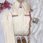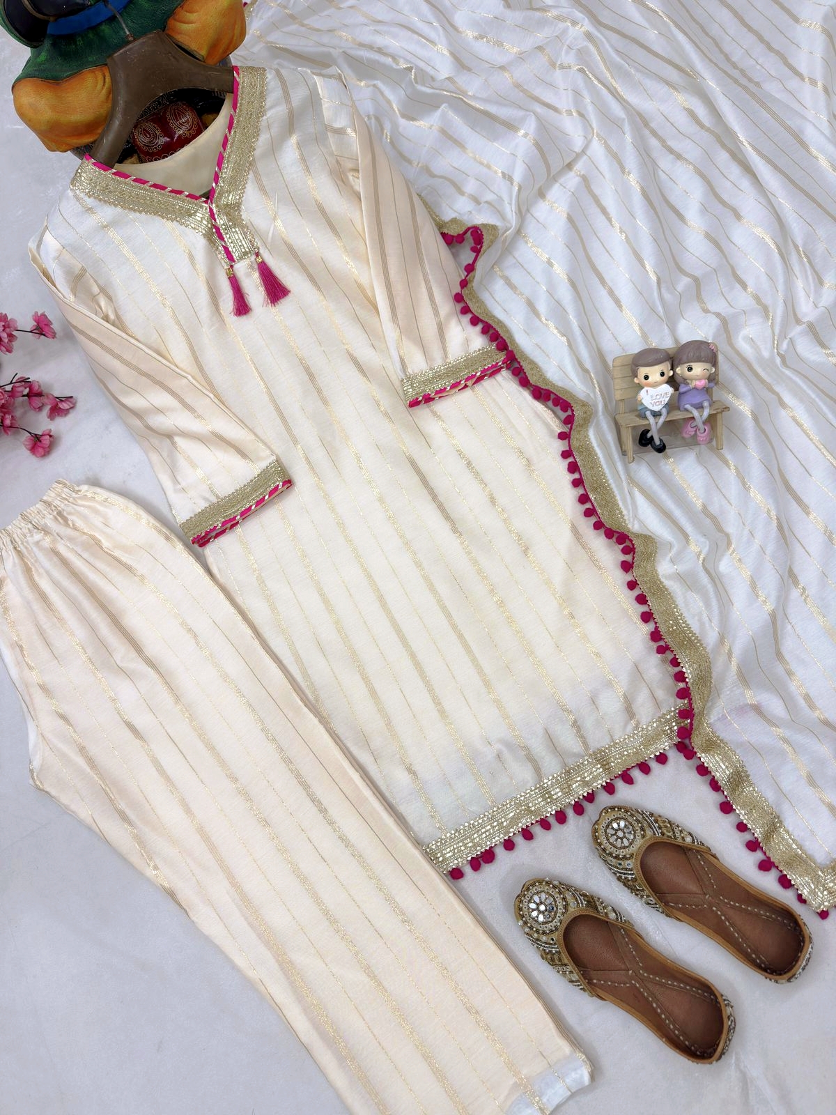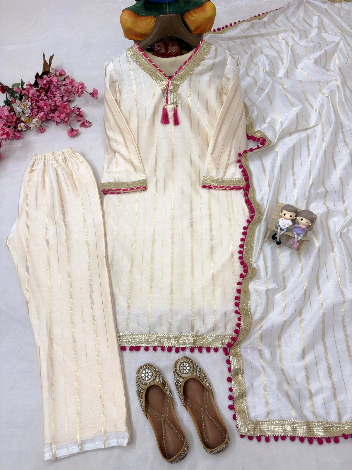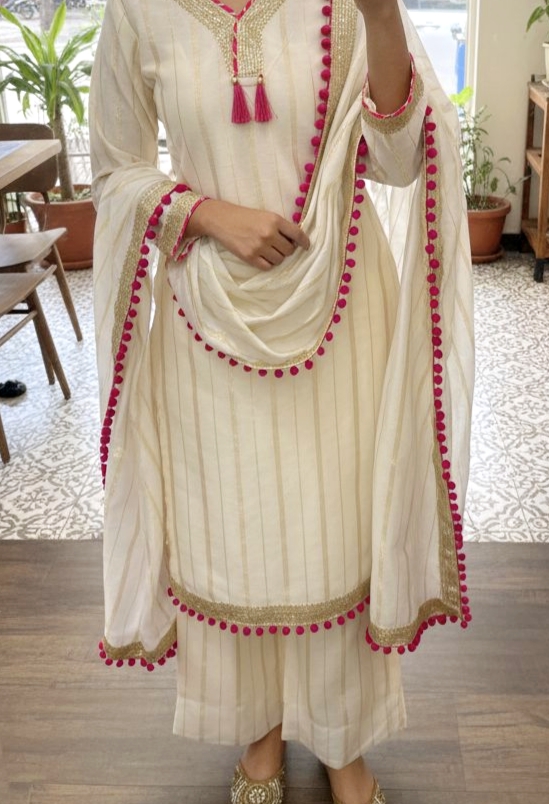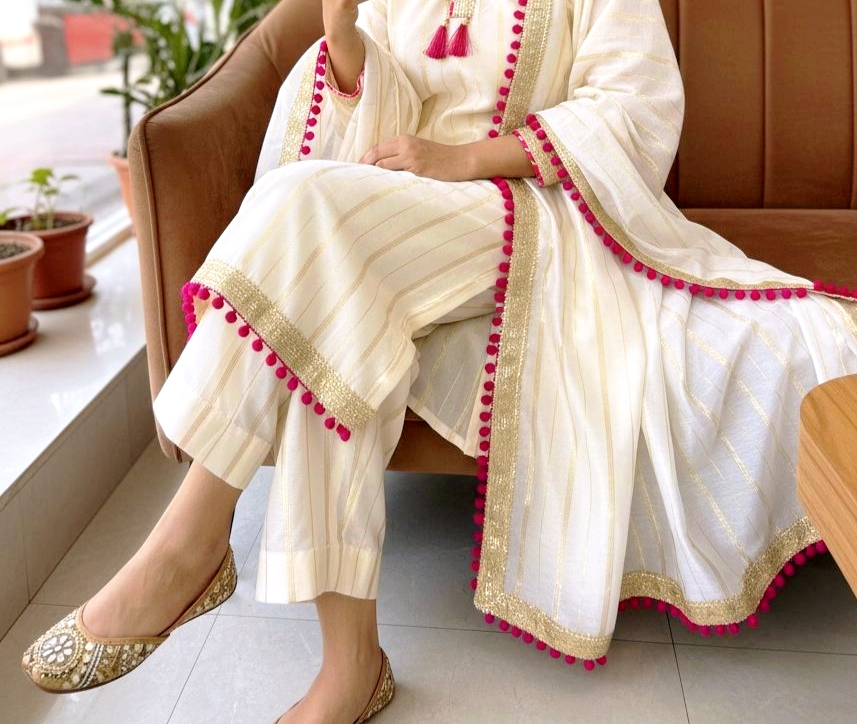 Crafted in premium Chanderi Silk, this elegant 3-piece set features delicate lace & pompom detailing on the kurti and dupatta for a refined festive charm.
