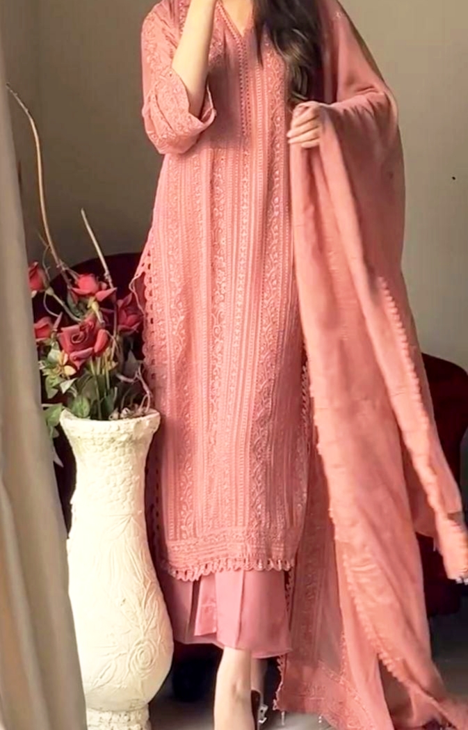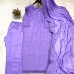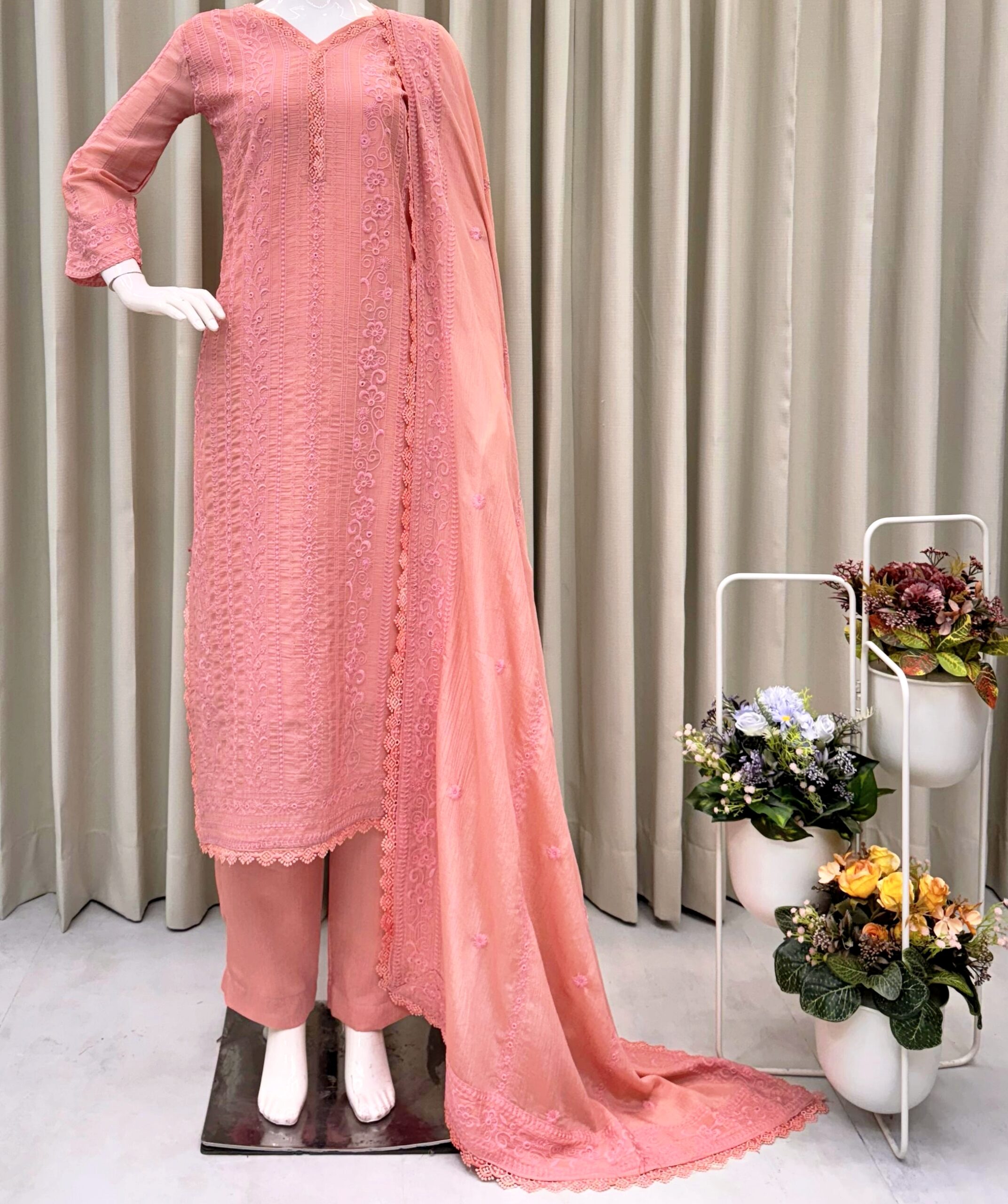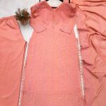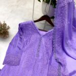 Indulge in elegance with this Premium Chinon embroidered set, designed to make a statement. Adorned with intricate cotton thread embroidery and delicate lace detailing, this ensemble blends sophistication with comfort.