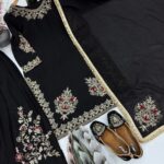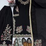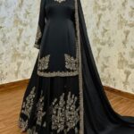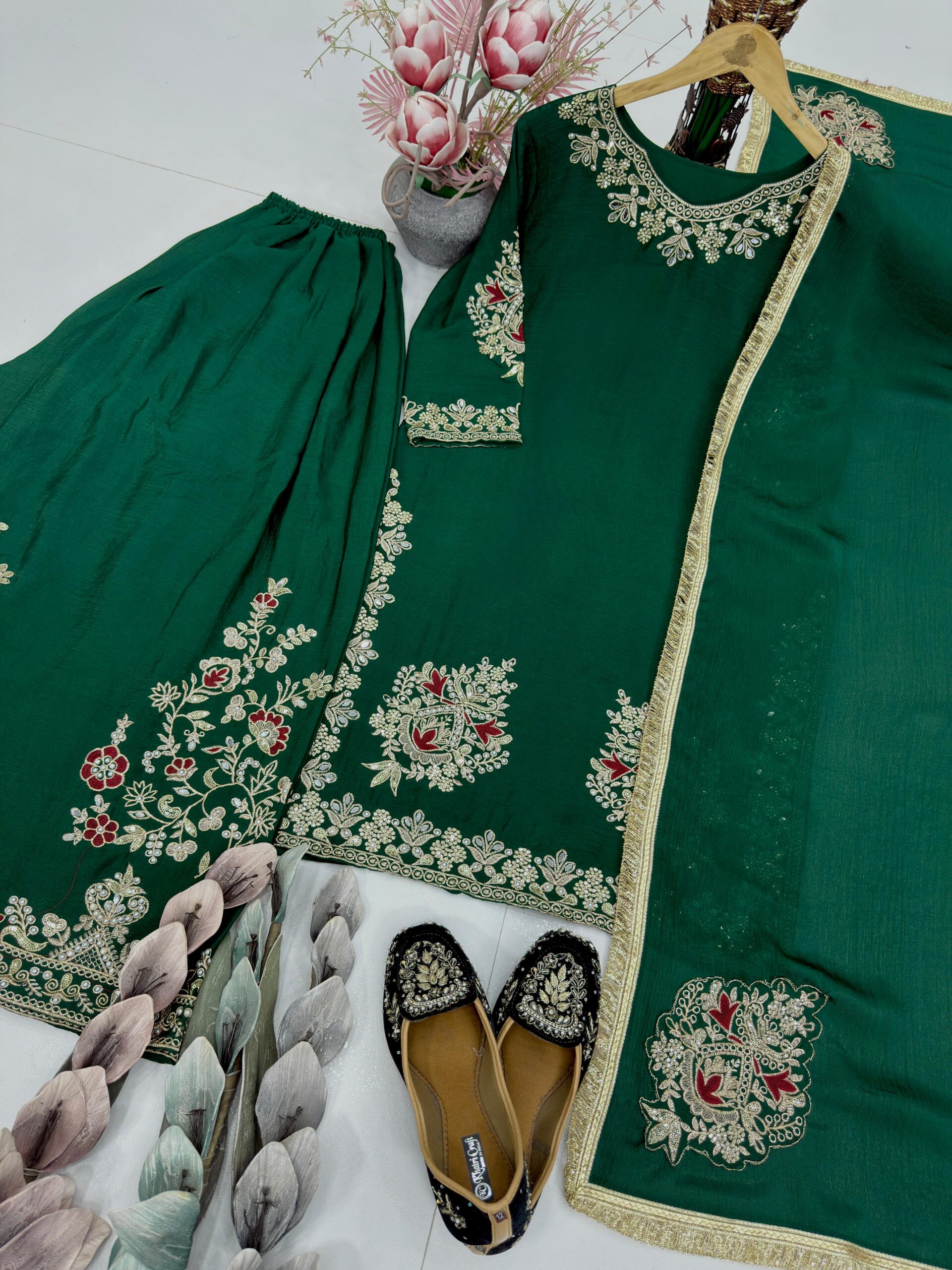 Step into any celebration with confidence in this exquisitely handcrafted ensemble made from rich Chinon fabric. Designed to make a bold statement, this three-piece set blends elegance, comfort, and intricate artistry.