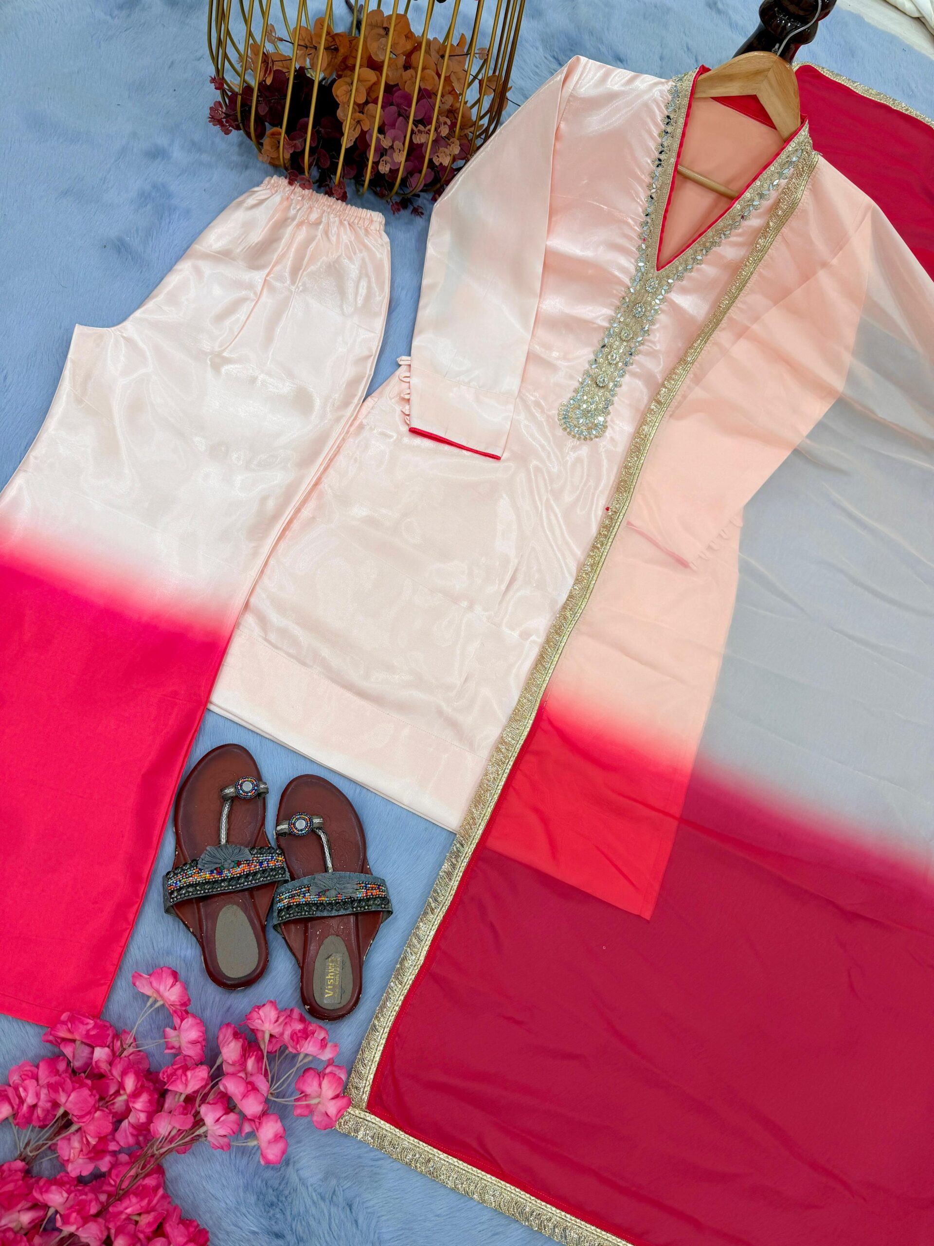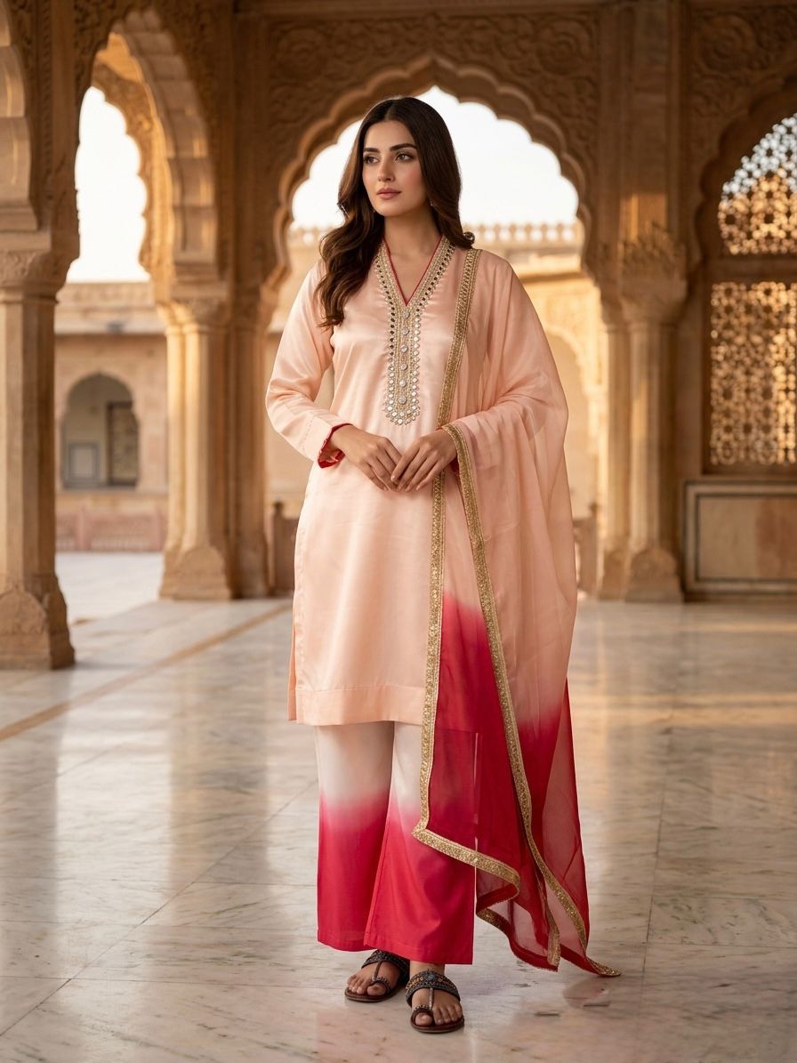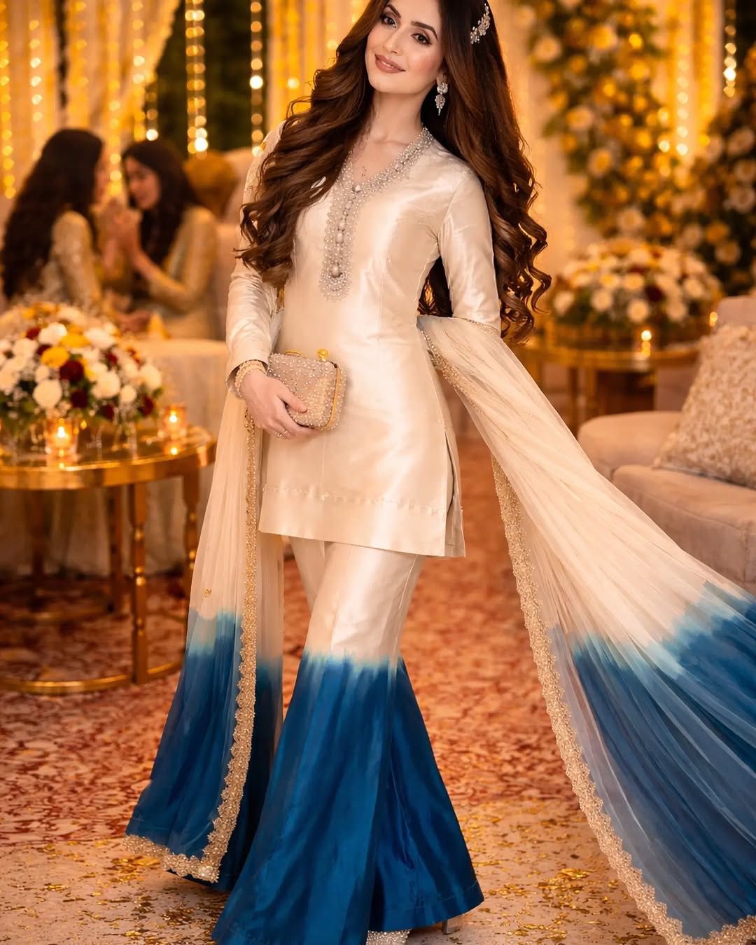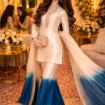 Top paired with a flowy dual-tone palazzo made from Roman Glass fabric and a dreamy Organza silk dupatta, finished with a fancy lace border.