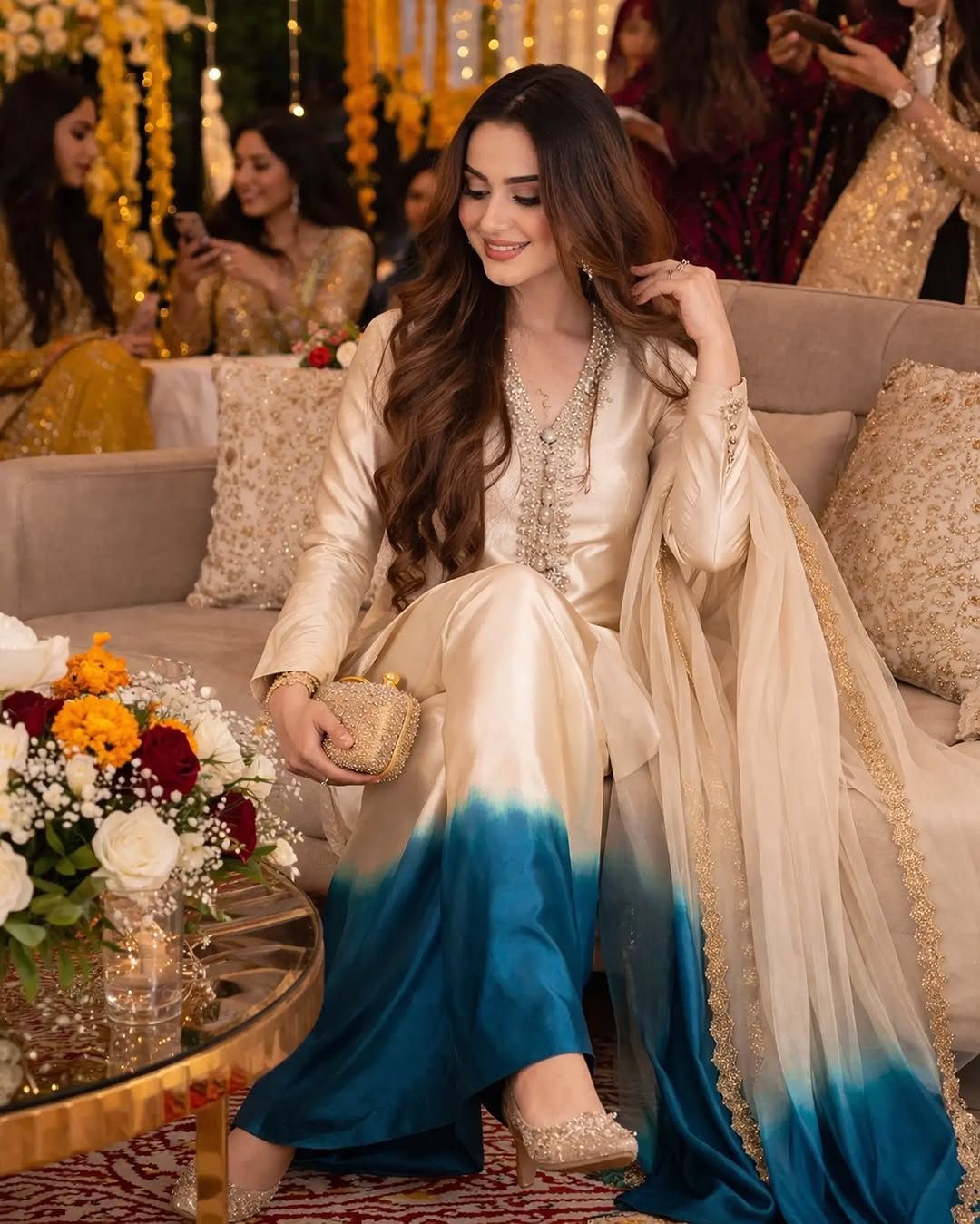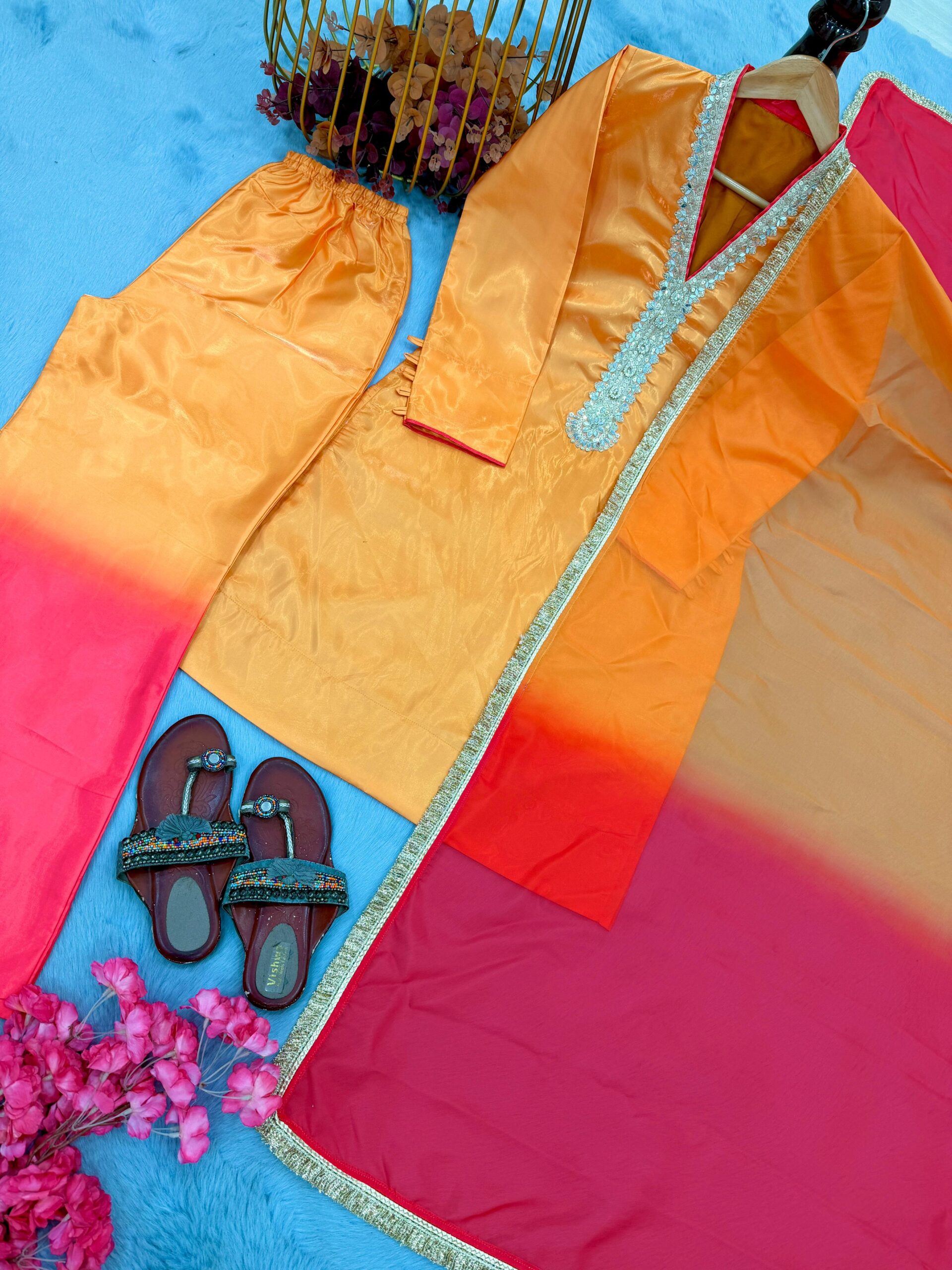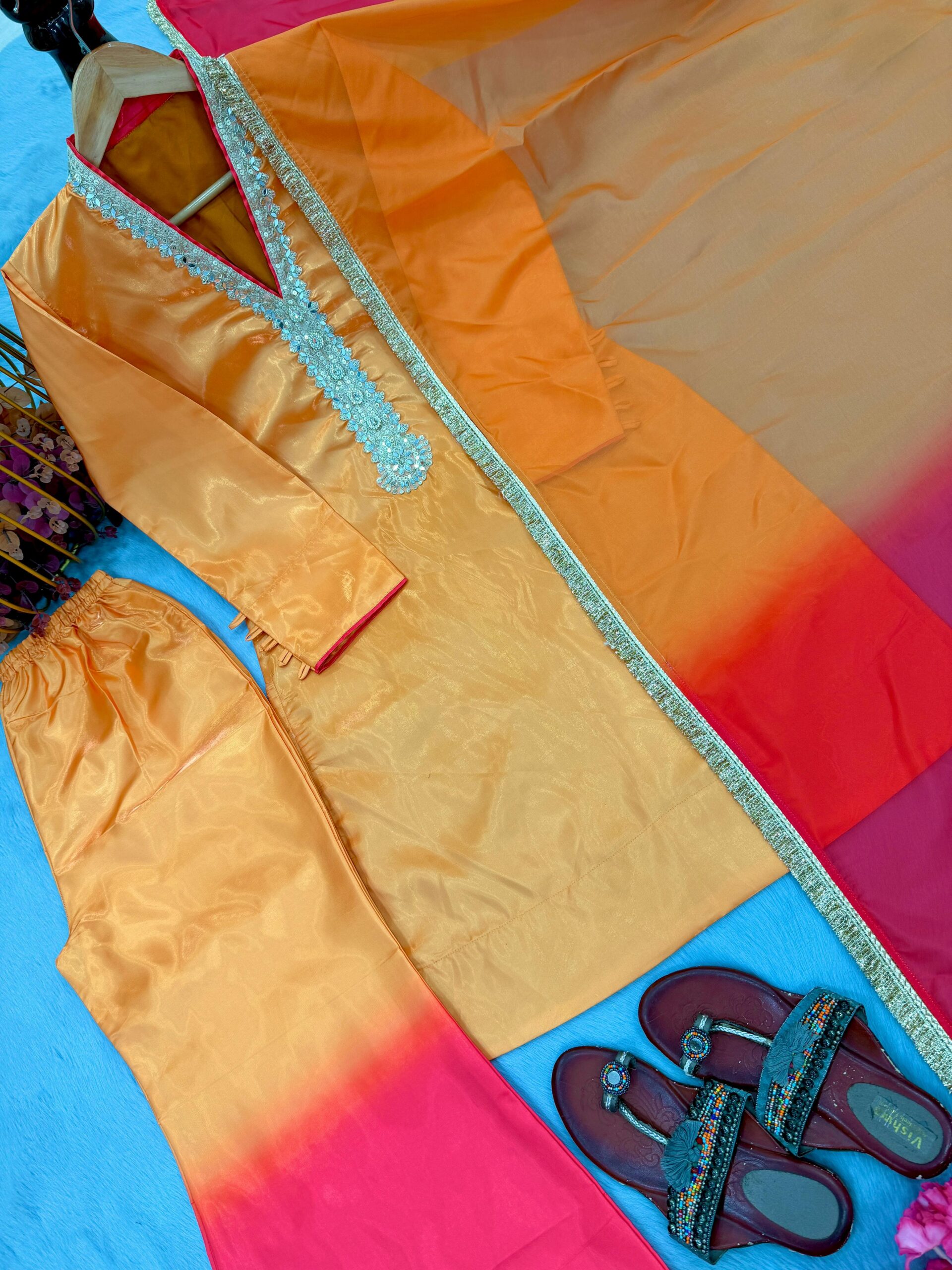 Top paired with a flowy dual-tone palazzo made from Roman Glass fabric and a dreamy Organza silk dupatta, finished with a fancy lace border.