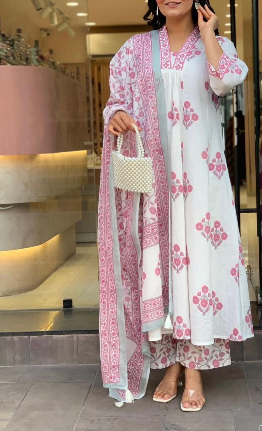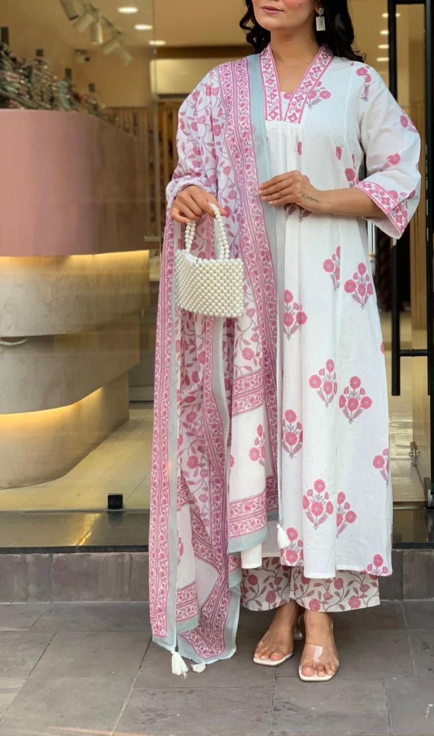 Elegant A-line kurti set with pant & dupatta, crafted in soft Cotton 60Γ—60 for a refined yet comfortable feel.