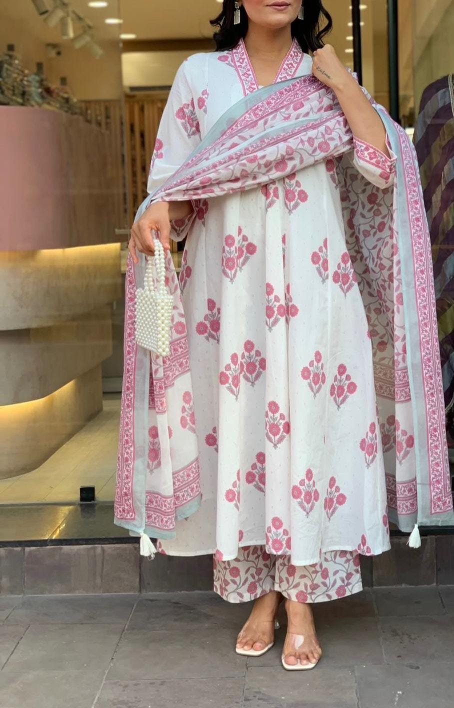 Step into timeless elegance with this beautifully crafted outfit, perfect for both everyday wear and special occasions. Designed to make you stand out, this A-line kurti set offers a graceful flare for a regal and sophisticated look.