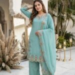 Intricate embroidery on a soft, flowy Romantic Glass fabric for top and palazzo.