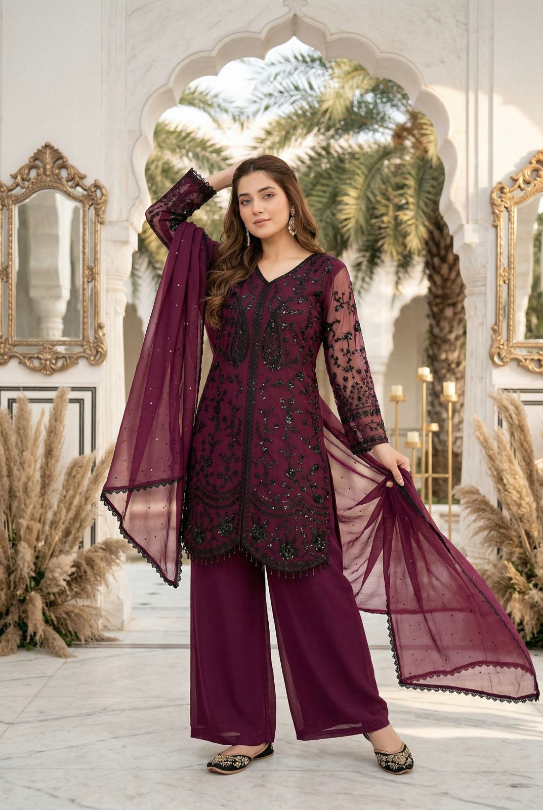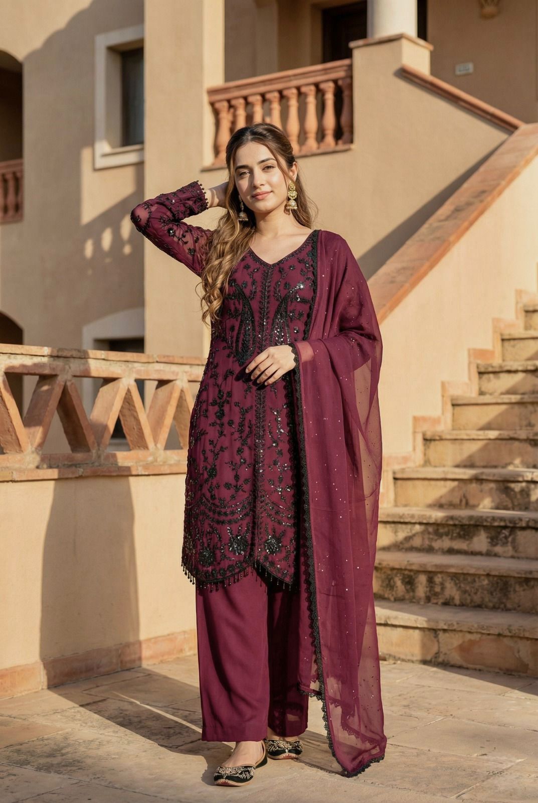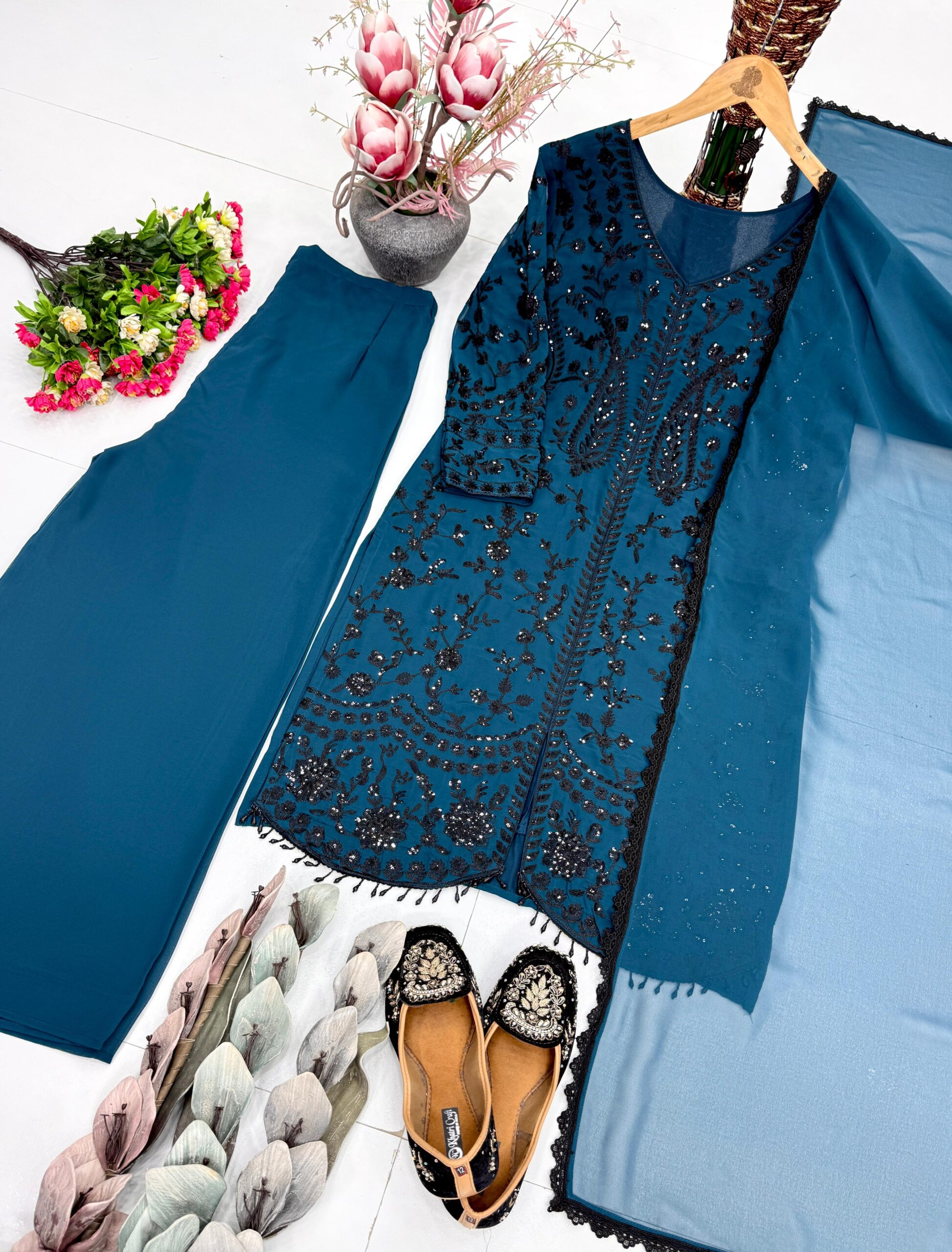 Top- Heavy faux georgette adorned with intricate chain sequence embroidery.