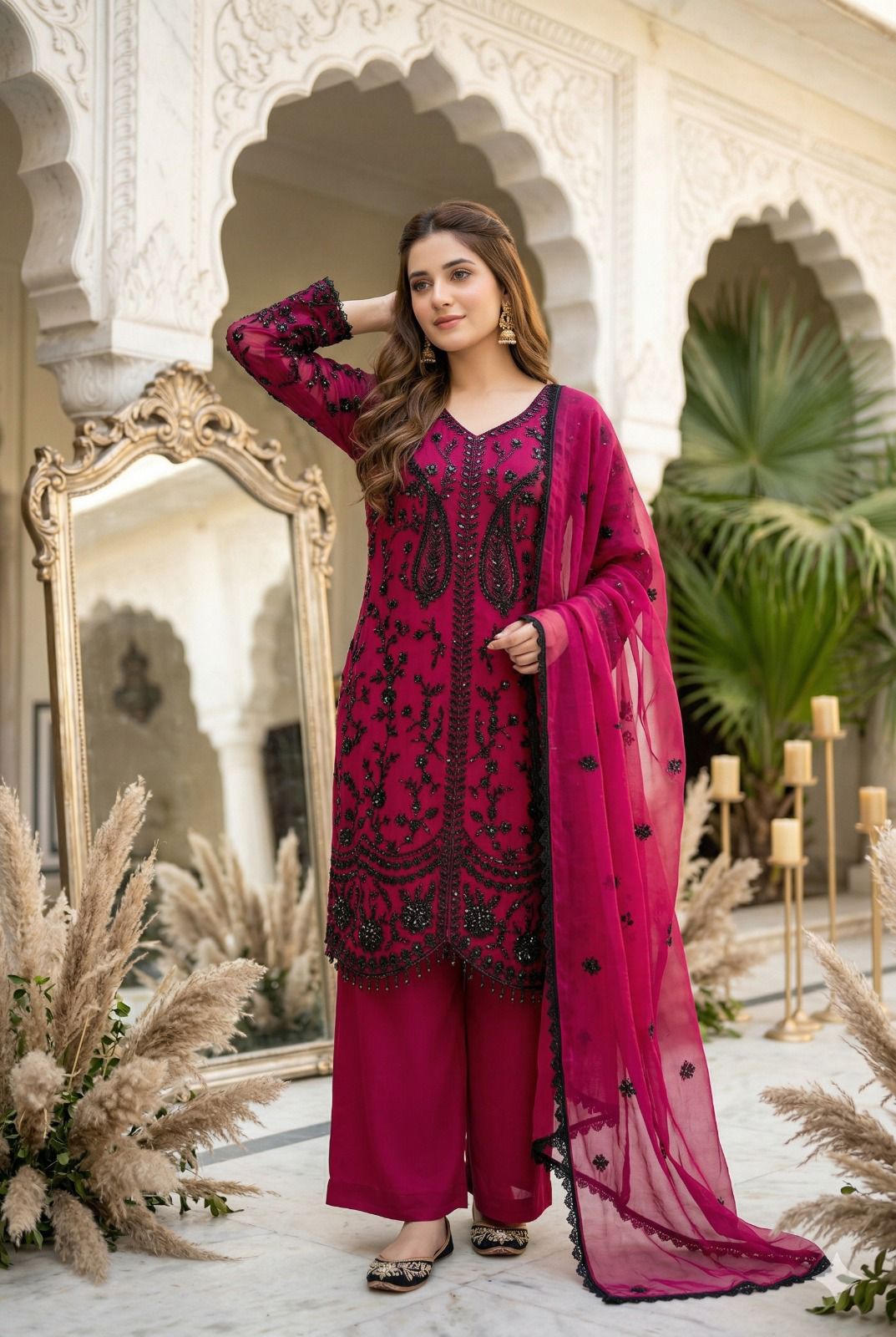 Bottom- Smooth heavy faux georgette fabric with a finish for a balanced luxury look.