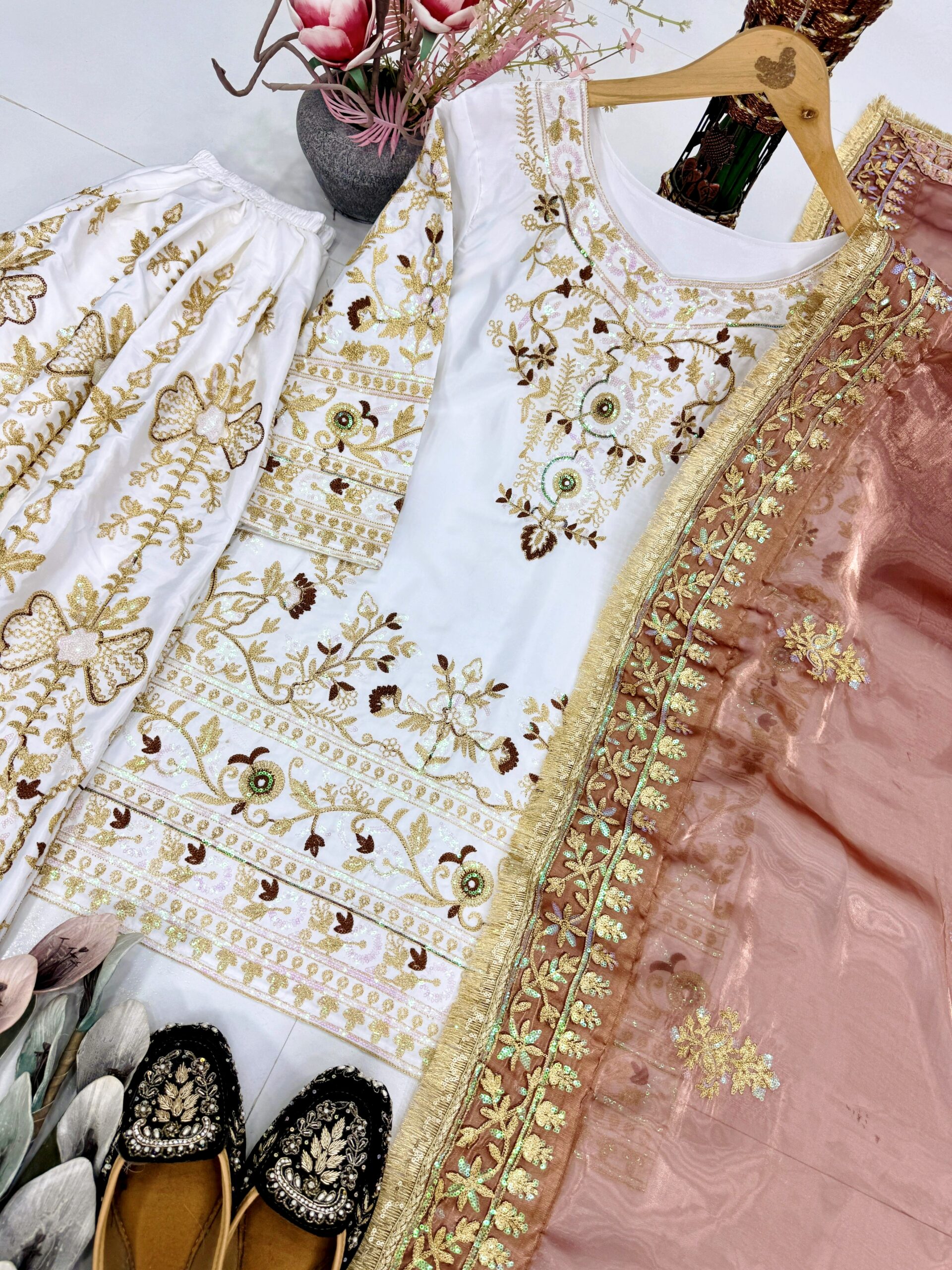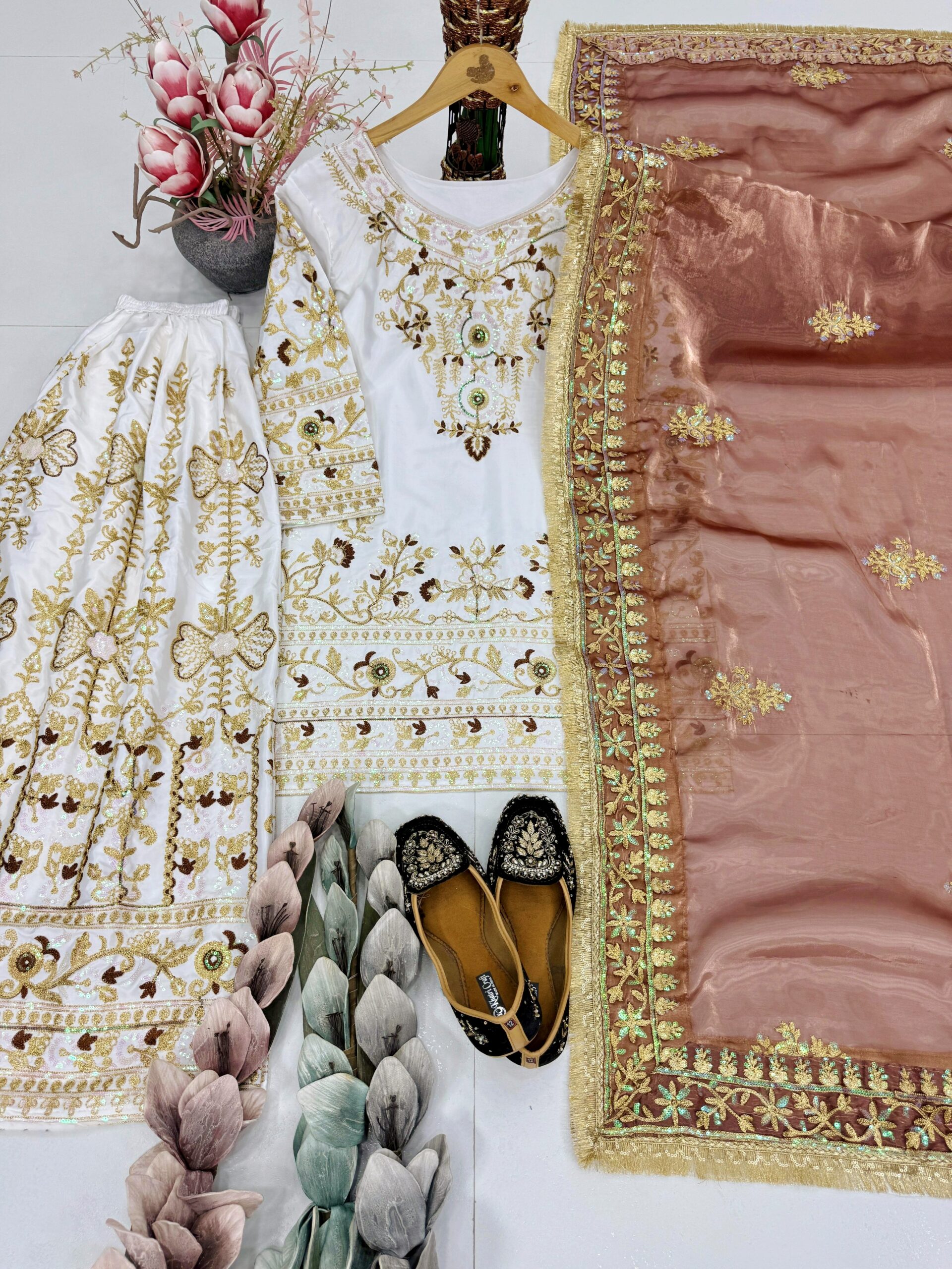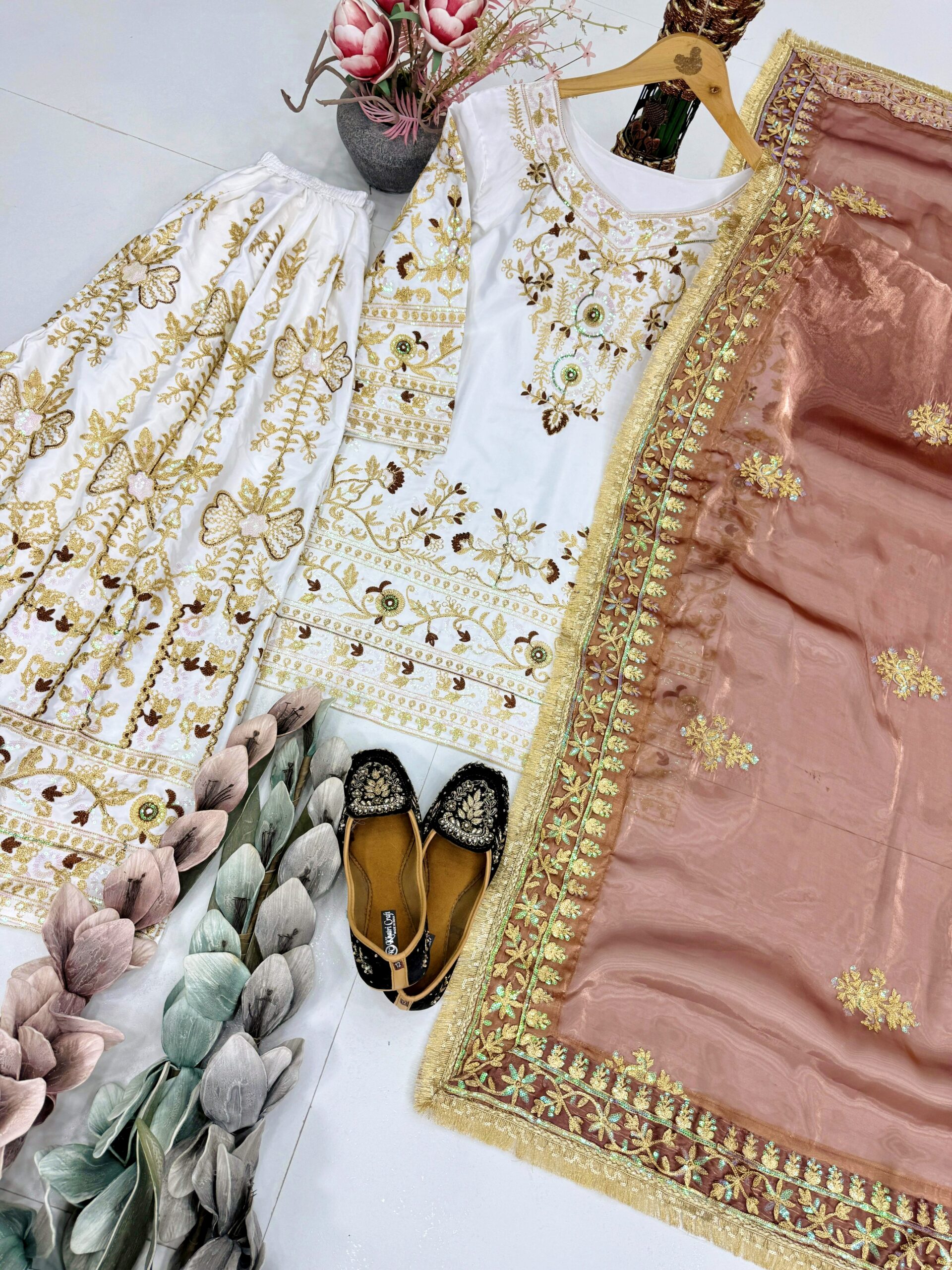 Elevate your festive look with our Designer Heavy Natural Silk Sharara Set. Ideal for weddings & festive occasions