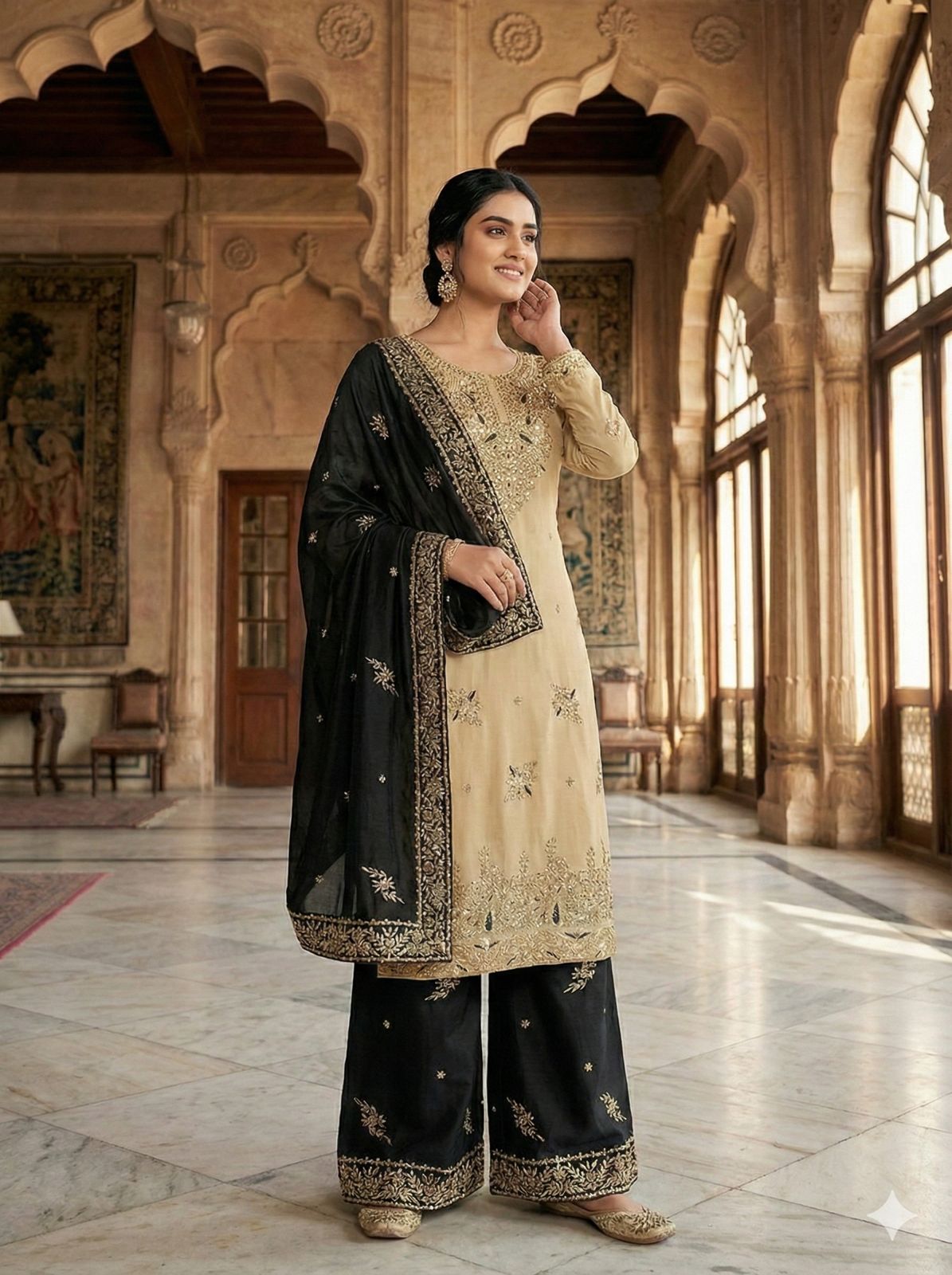 Intricately adorned with heavy embroidery & fine sequence work, this refined Topโ€“Plazzoโ€“Dupatta set reflects timeless elegance and modern grace.