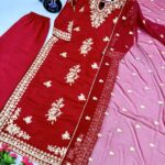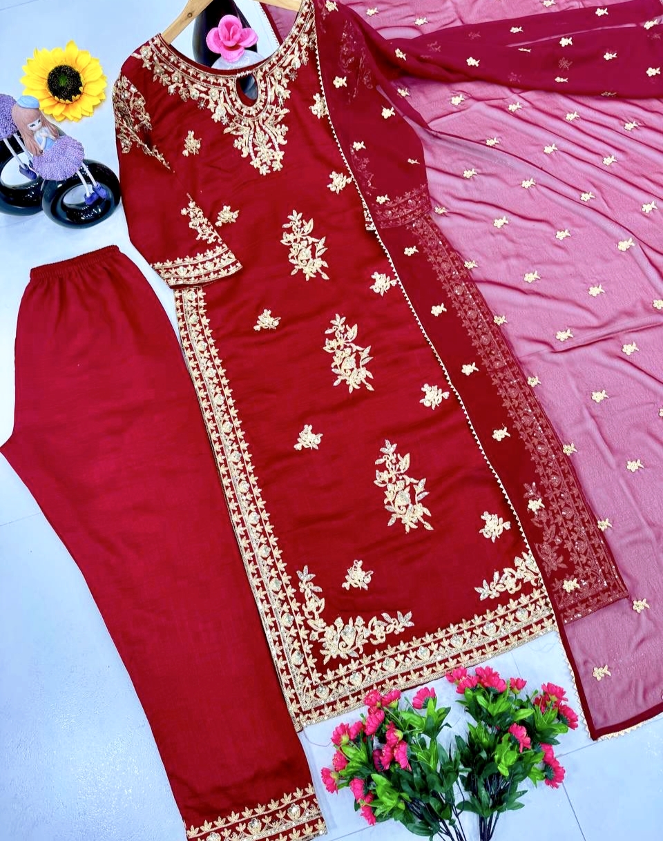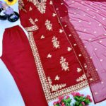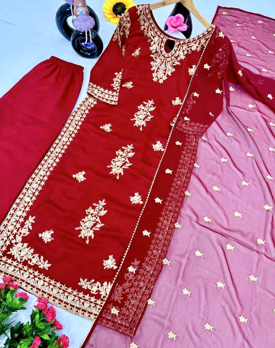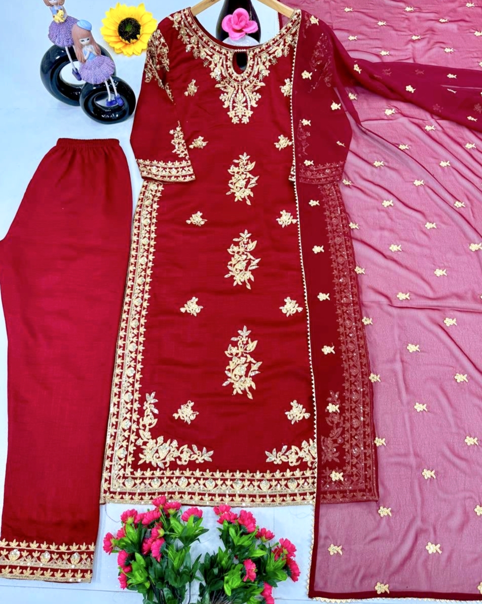 Crafted in luxurious heavy Vichitra silk, this designer party wear set features exquisite all-over embroidered sequence work, paired with a graceful palazzo and a delicately bordered dupatta.