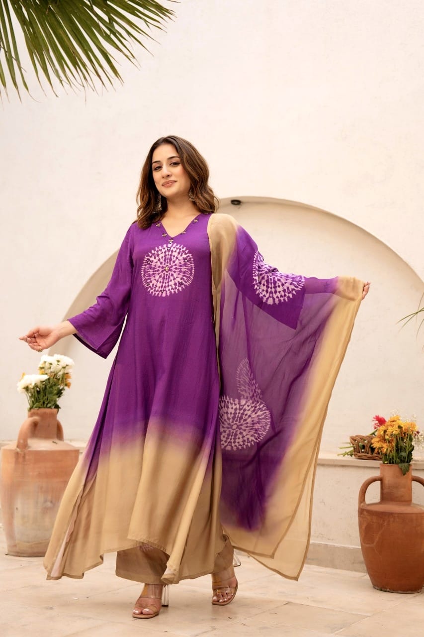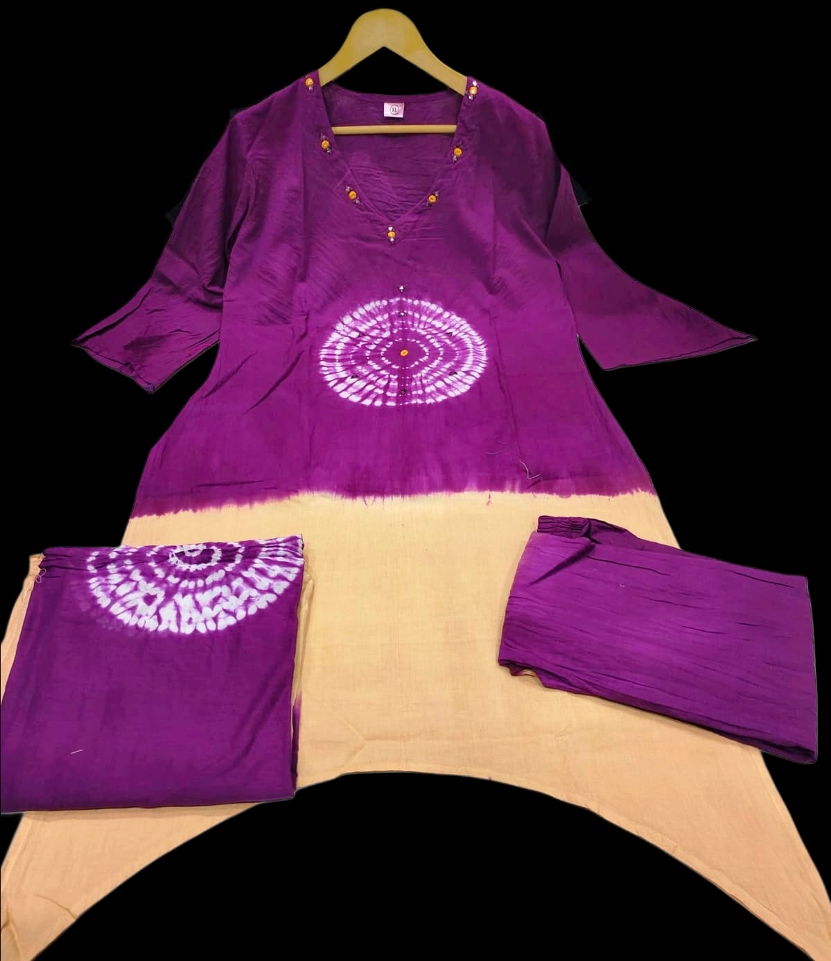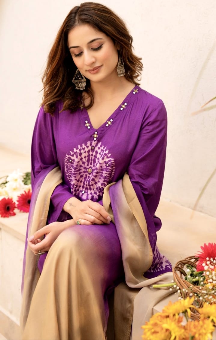 Designed in a flattering A-line silhouette, this set features a stunning tie-dye inspired circular print on the front and sleeves, blending contemporary style with a touch of tradition.