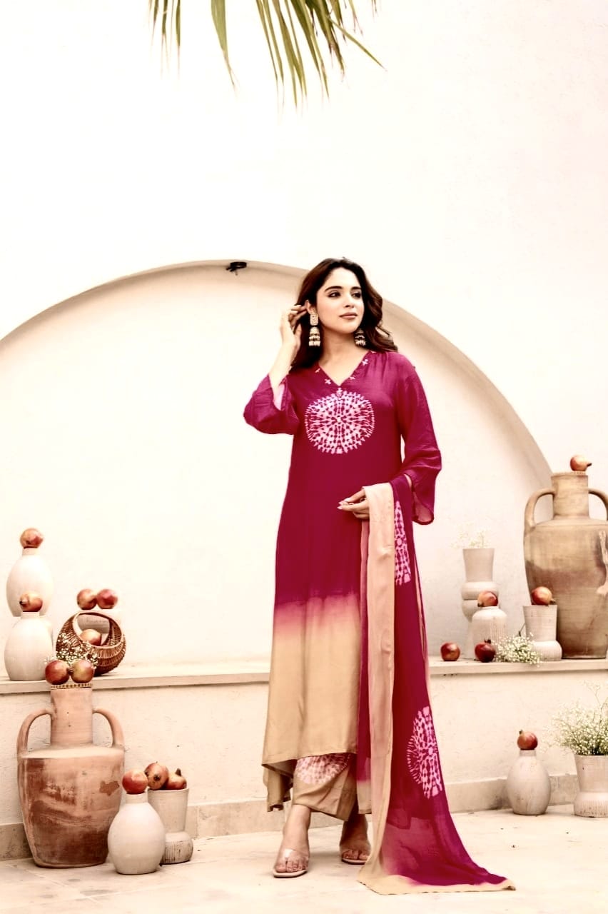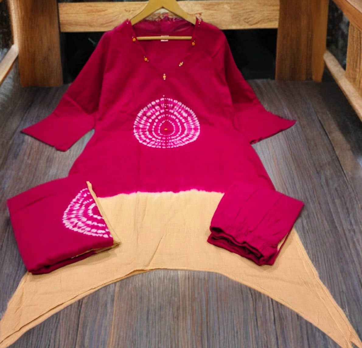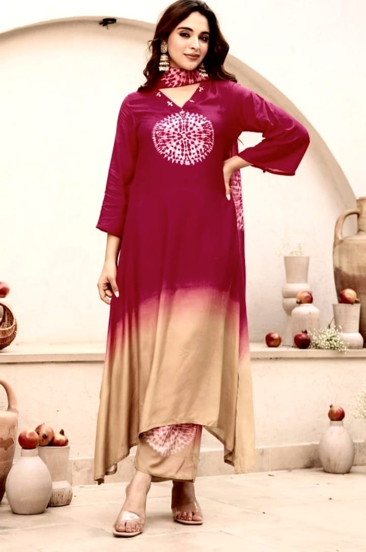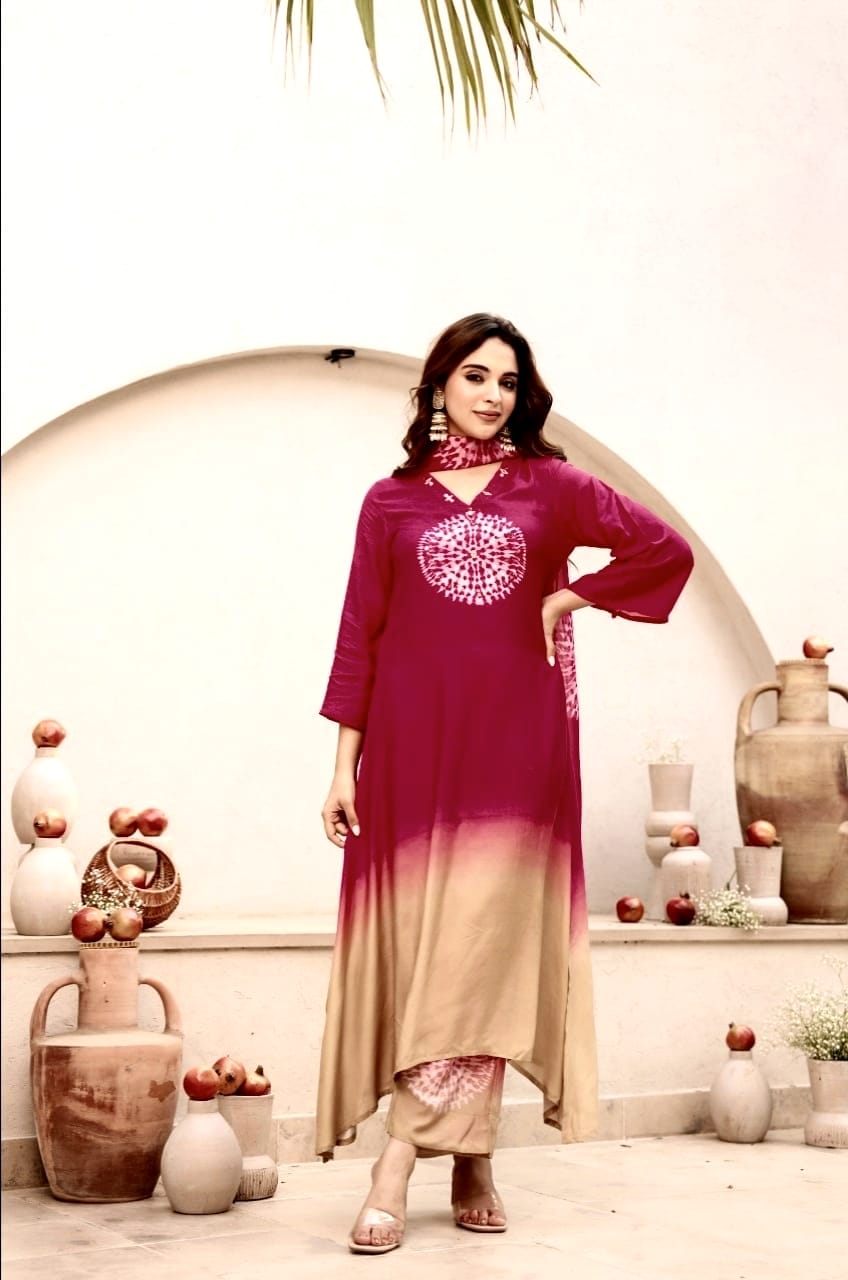 Designed in a flattering A-line silhouette, this set features a stunning tie-dye inspired circular print on the front and sleeves, blending contemporary style with a touch of tradition.