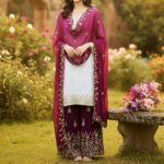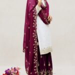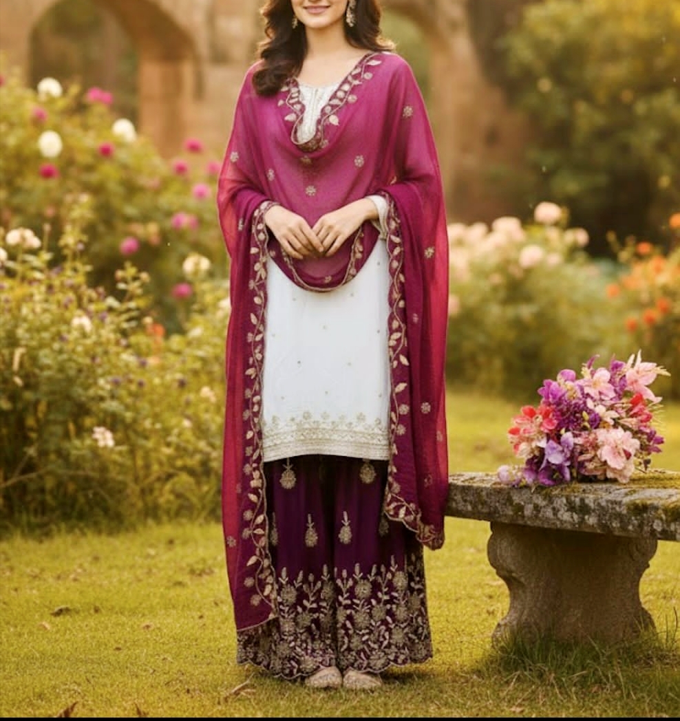 Elevate your festive and partywear style with this New Designer Sharara Suit with Dupatta Set. Crafted in rich Zimmy Silk and adorned with elegant 5mm sequence embroidery, this fully stitched outfit blends comfort with timeless glamour.