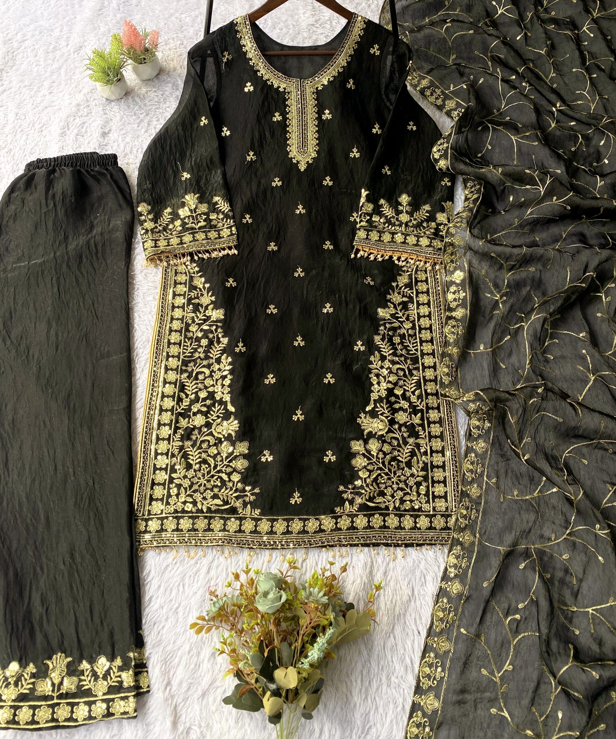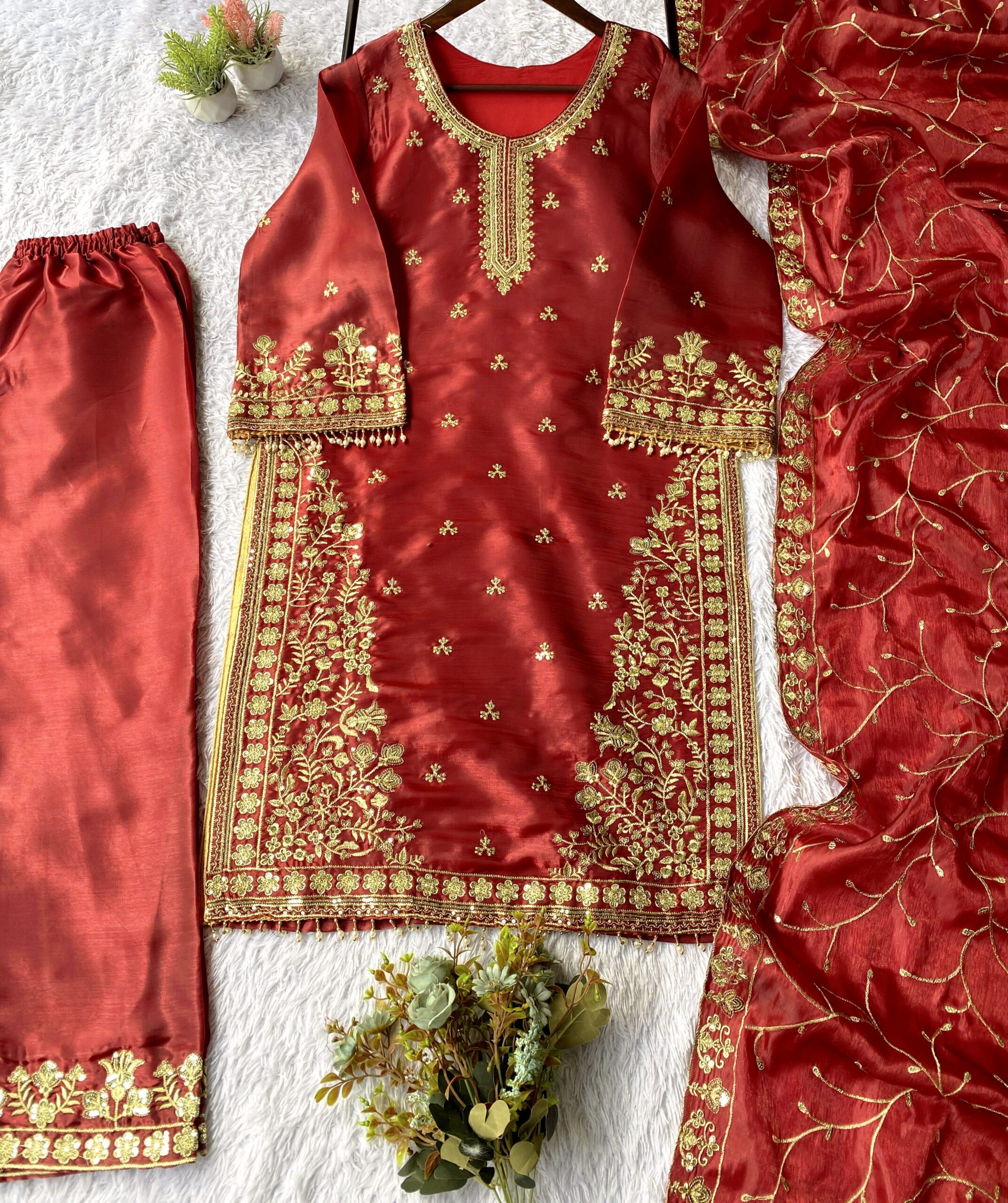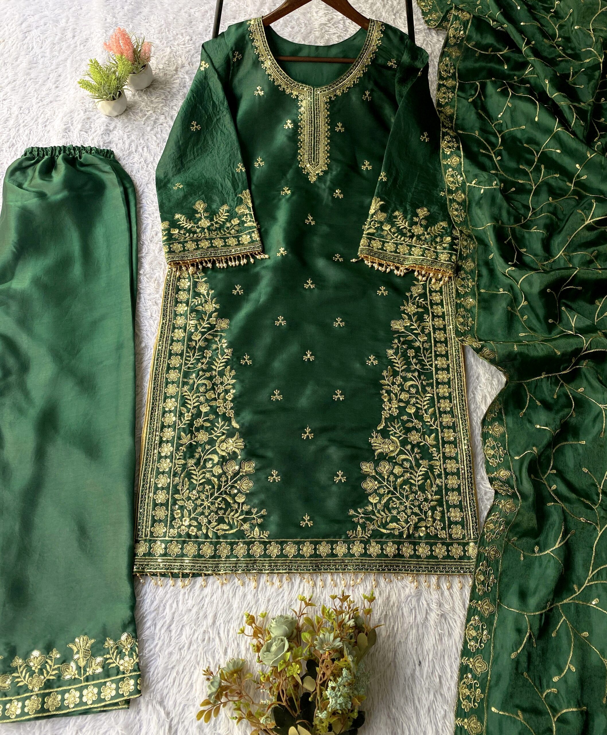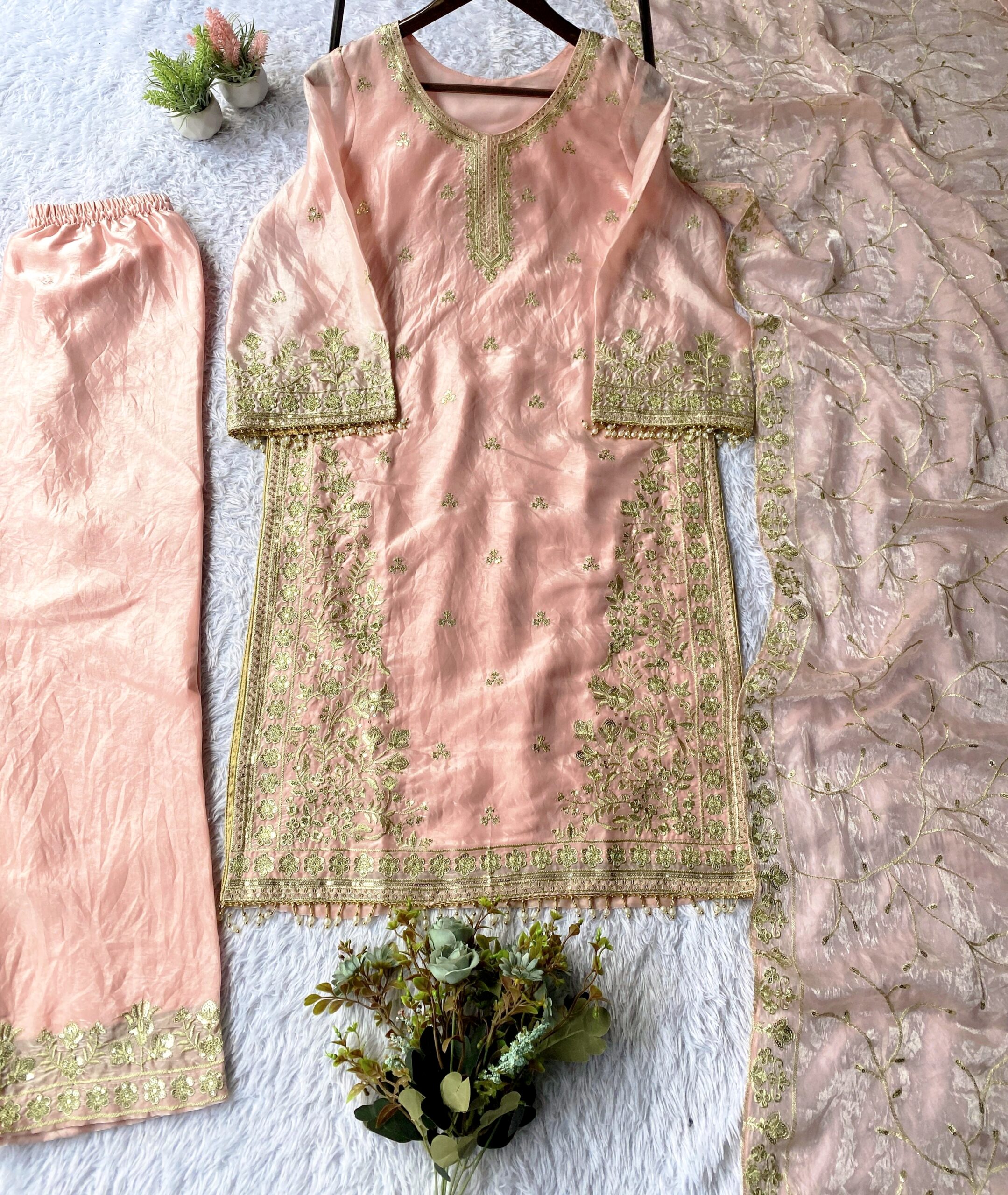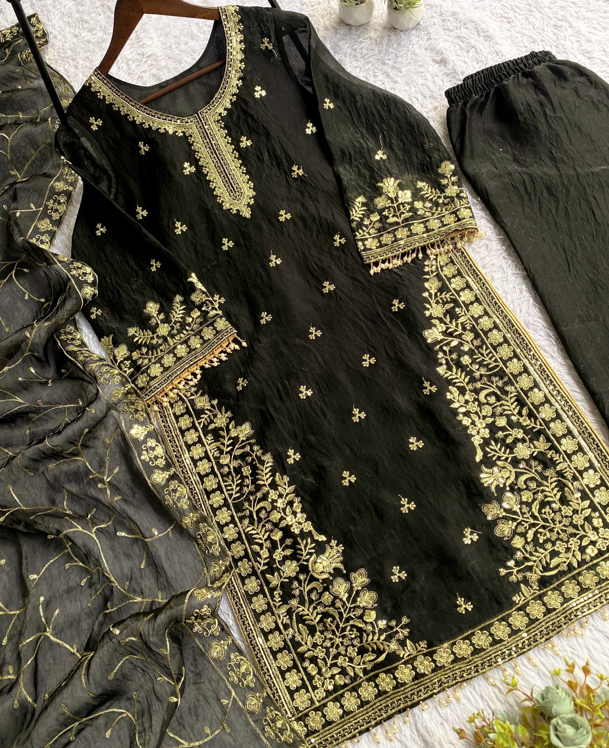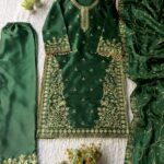 Turn heads this festive and wedding season with our premium sequence embroidery worked TopโPantโDupatta set, crafted in luxurious Jimmy Choo fabric for a rich and graceful look.
