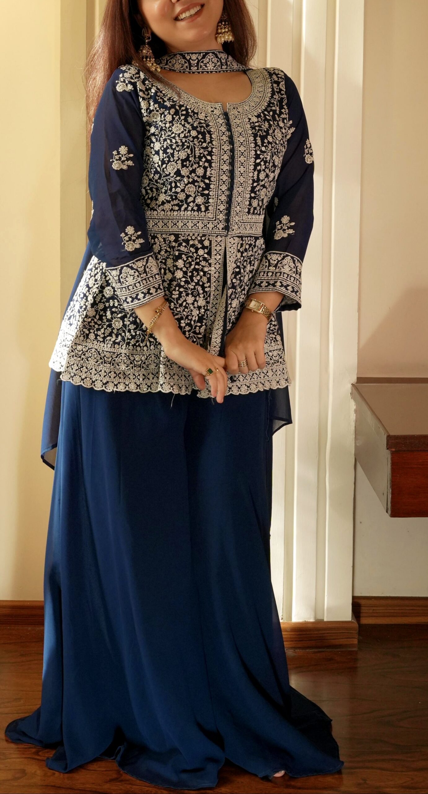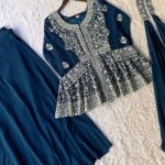 Indulge in refined festive luxury with our Embroidered Peplum Top & Palazzo Ensemble.
