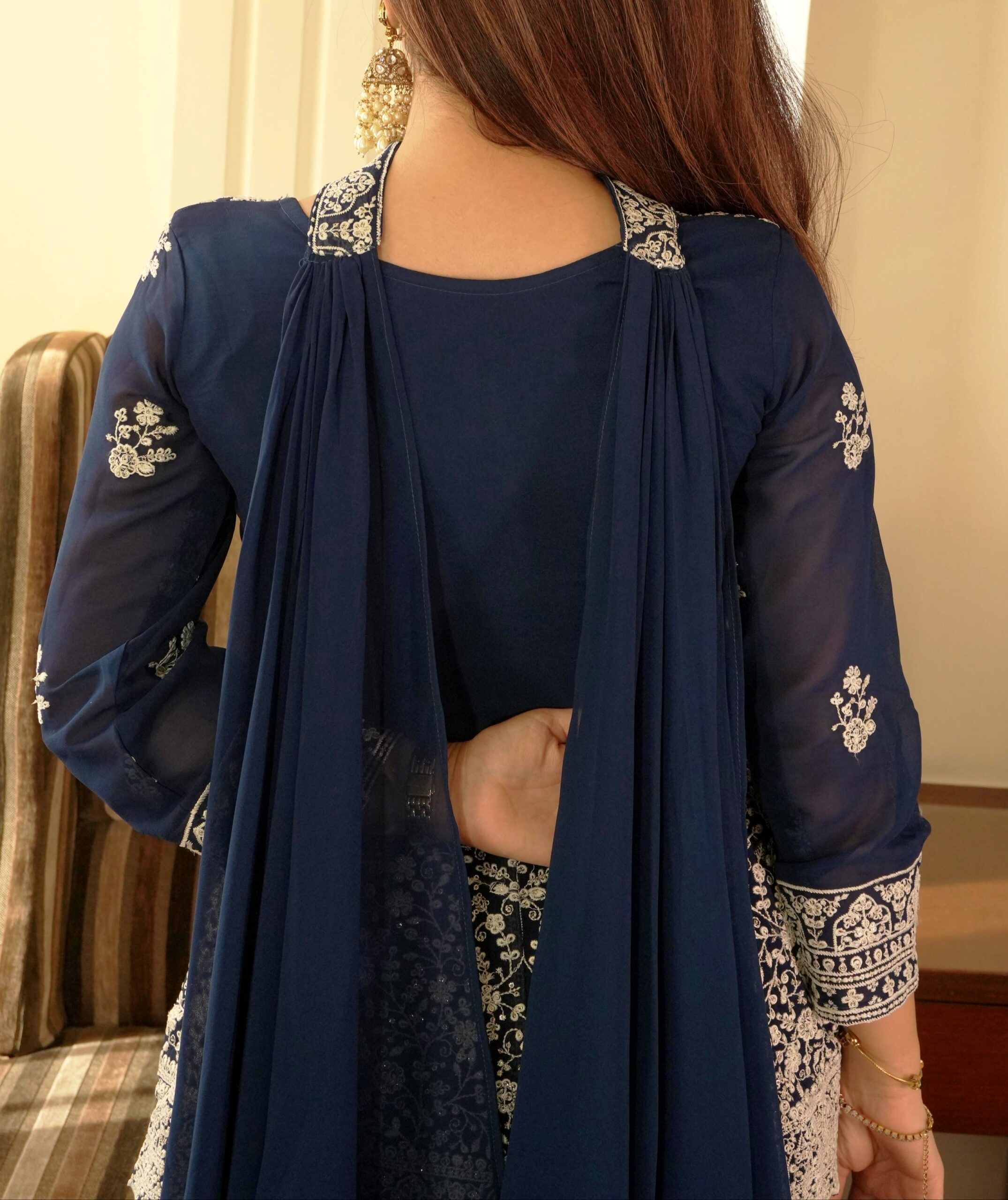Designed in fluid georgette and adorned with intricate sequin embroidery, this silhouette blends modern grace with classic charm.