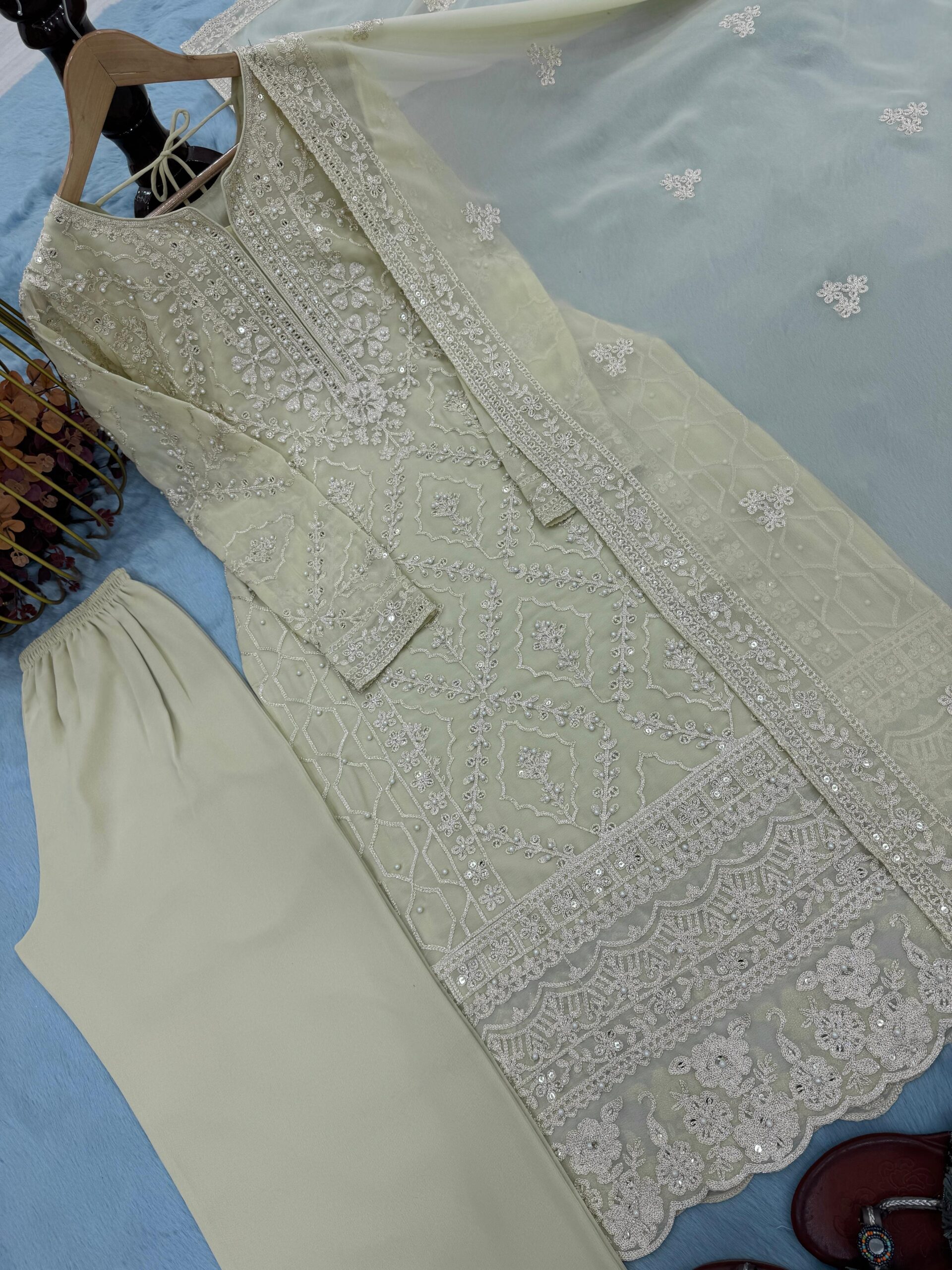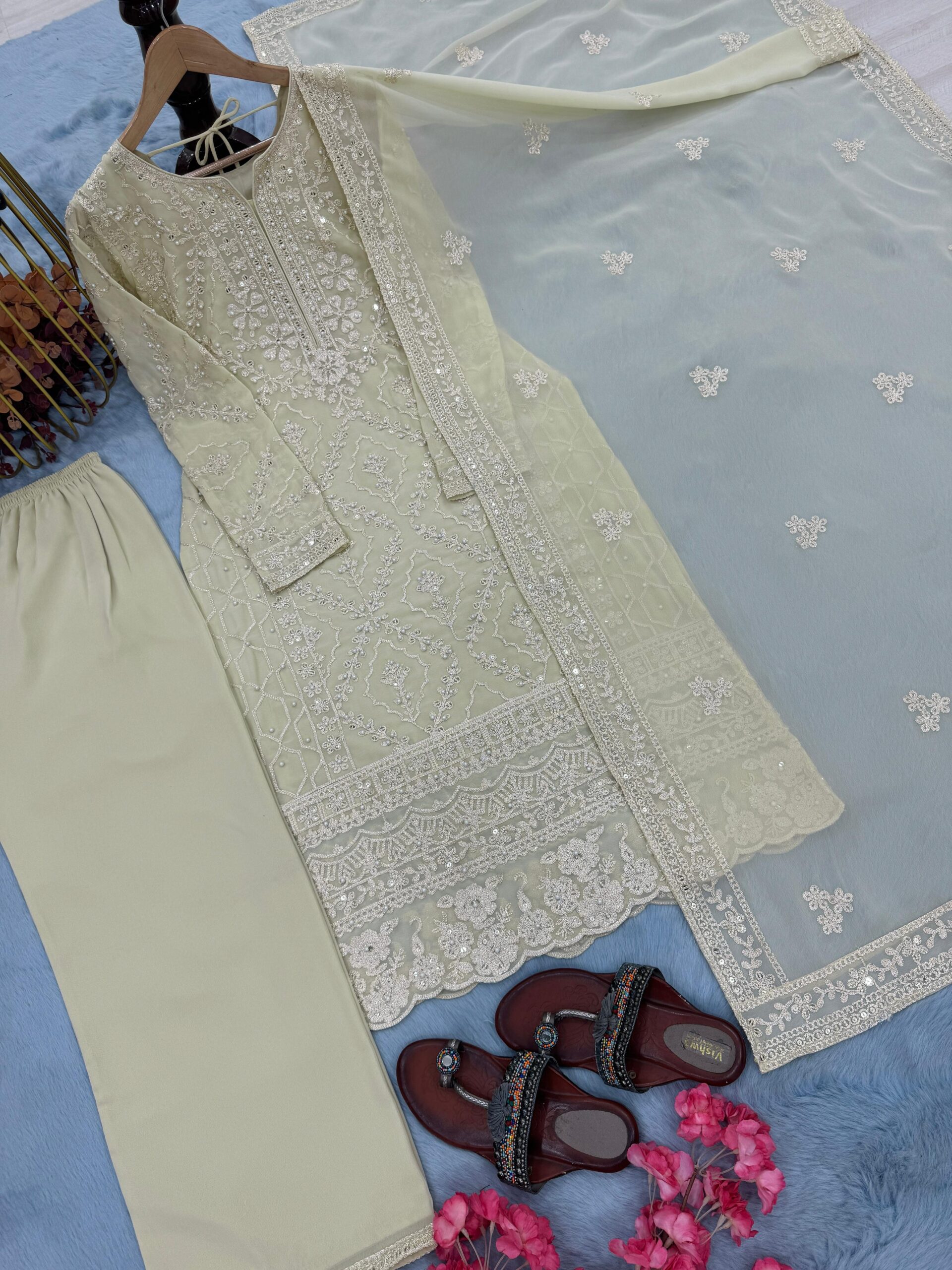 Make a stunning statement at any festive or party occasion with this elegant designer ensemble, crafted with premium fabrics and intricate detailing.