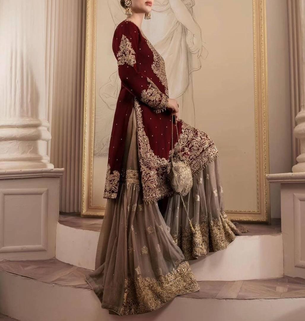 Fabric: Heavy Faux Georgette with Heavy Embroidery, Coding Dori & Sequence Work + Rivet Moti Work.