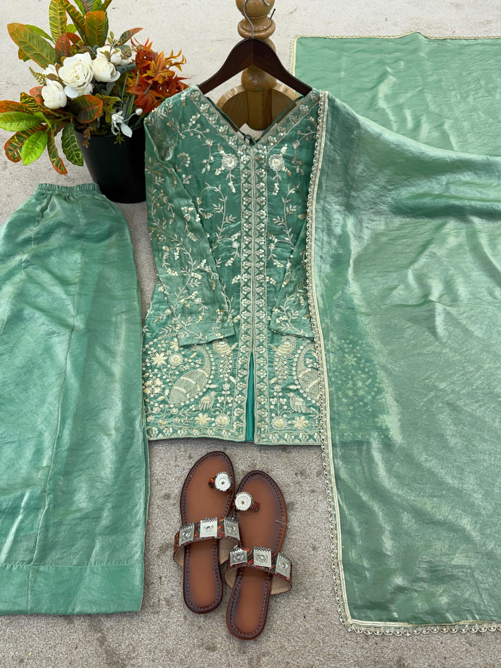 Crafted in silk and adorned with intricate embroidery & shimmering sequence work, this ensemble is all about effortless glamour and timeless charm.
