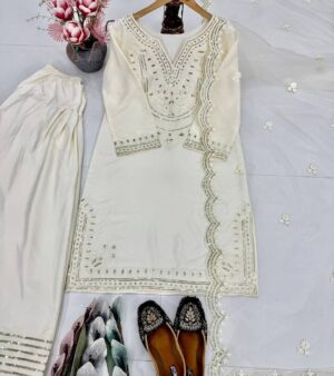 Elevate your festive look with this beautifully crafted ethnic ensemble, designed in luxurious Pure Chinon Silk and adorned with elegant Sequin Embroidery Work.