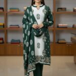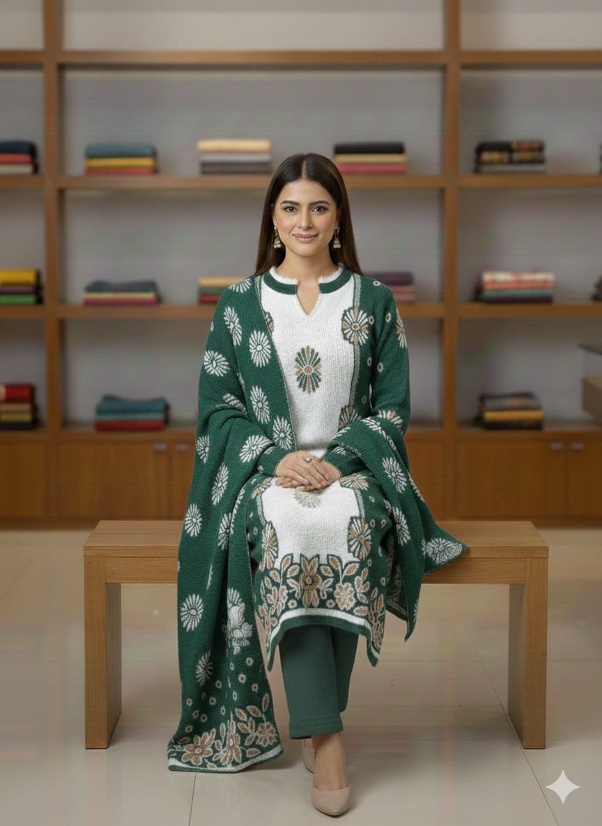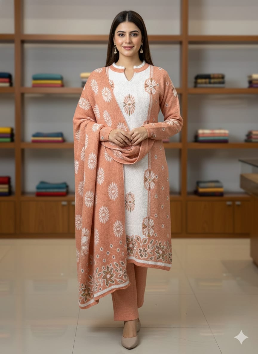 Upgrade your winter ethnic collection with this Premium Hair Wool Suit Set, featuring finely handcrafted embroidery on the top and bottom. The elegant dupatta adds the perfect finishing touch for any occasion.