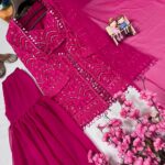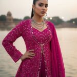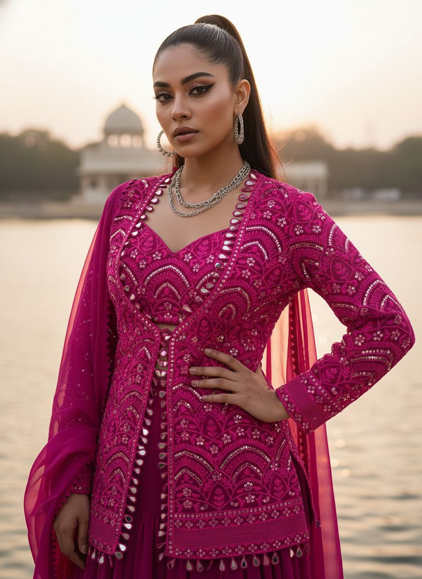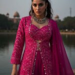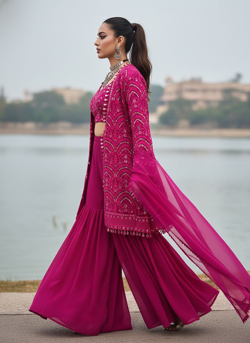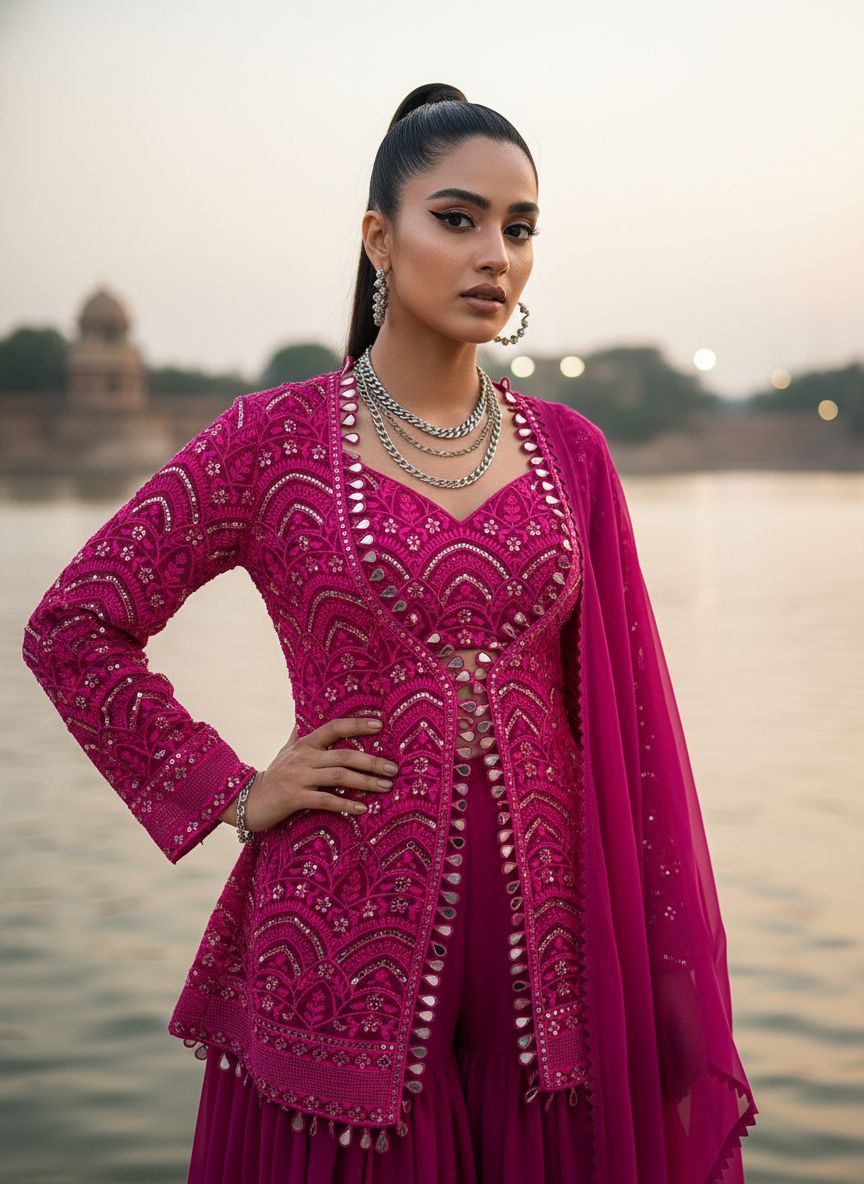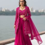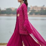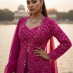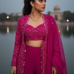 The breezy sharara, statement jacket & lace-bordered dupatta come together to create a look that’s effortlessly chic and celebration-ready.