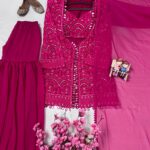 Drape yourself in elegance with this stunning, beautifully crafted in flowy premium georgette, adorned with delicate thread embroidery, shimmering sequins & real mirror detailing.