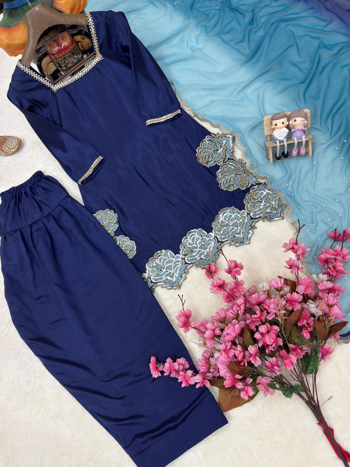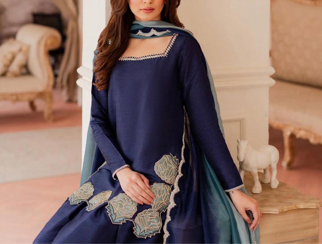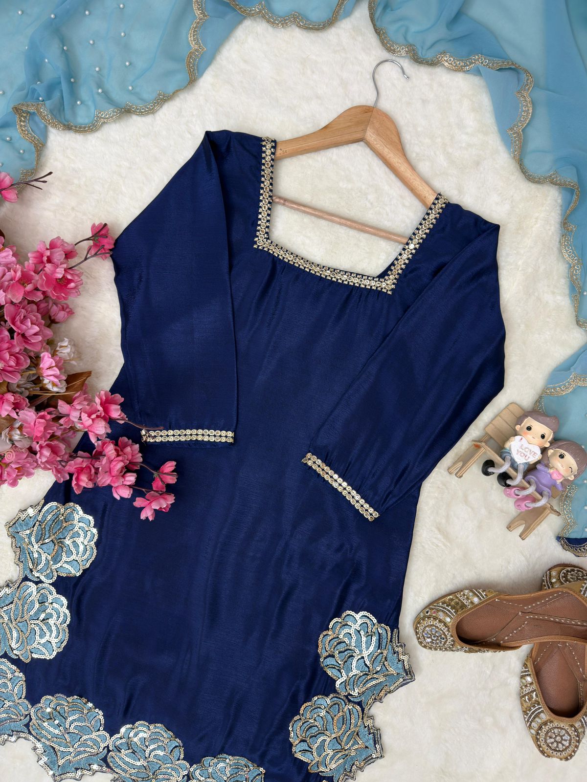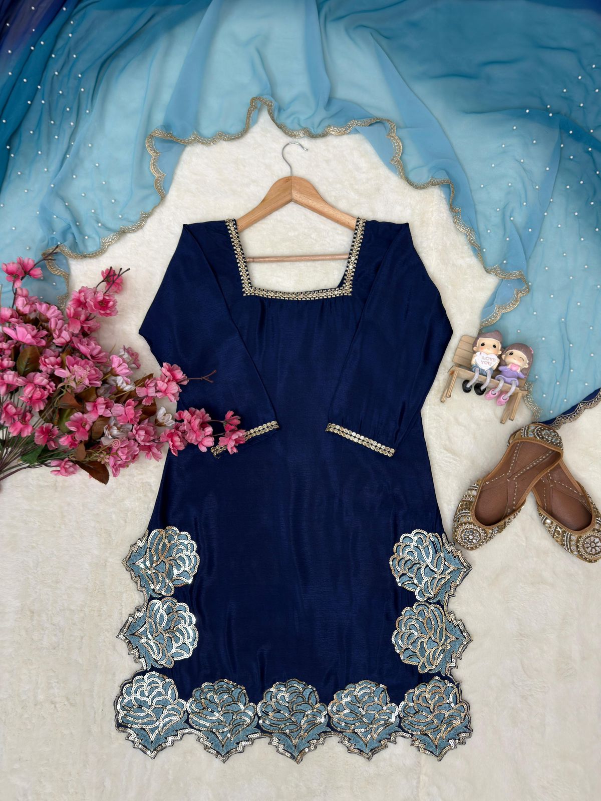 Kurti: Chinon silk with sequence & zari work .