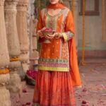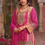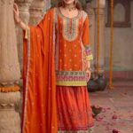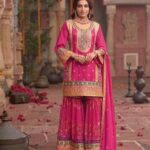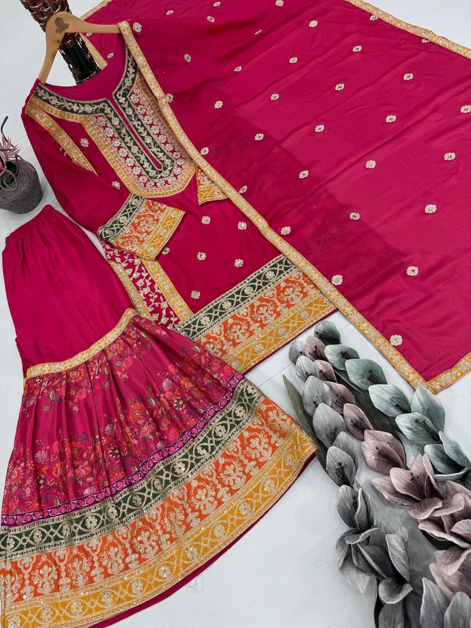 Grace your festive look with this luxurious boutique-style Sharara set crafted in premium Heavy Chinon Silk, beautifully adorned with Chine Sequins and real mirror handwork for a rich, elegant finish.