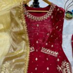 Premium silk dupatta adorned with heavy moti work and beautiful four-side lace detailing, adding a graceful and festive finish.