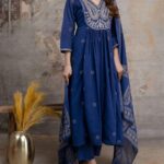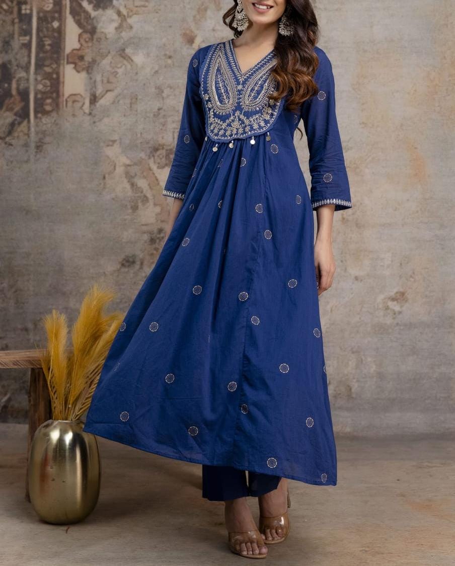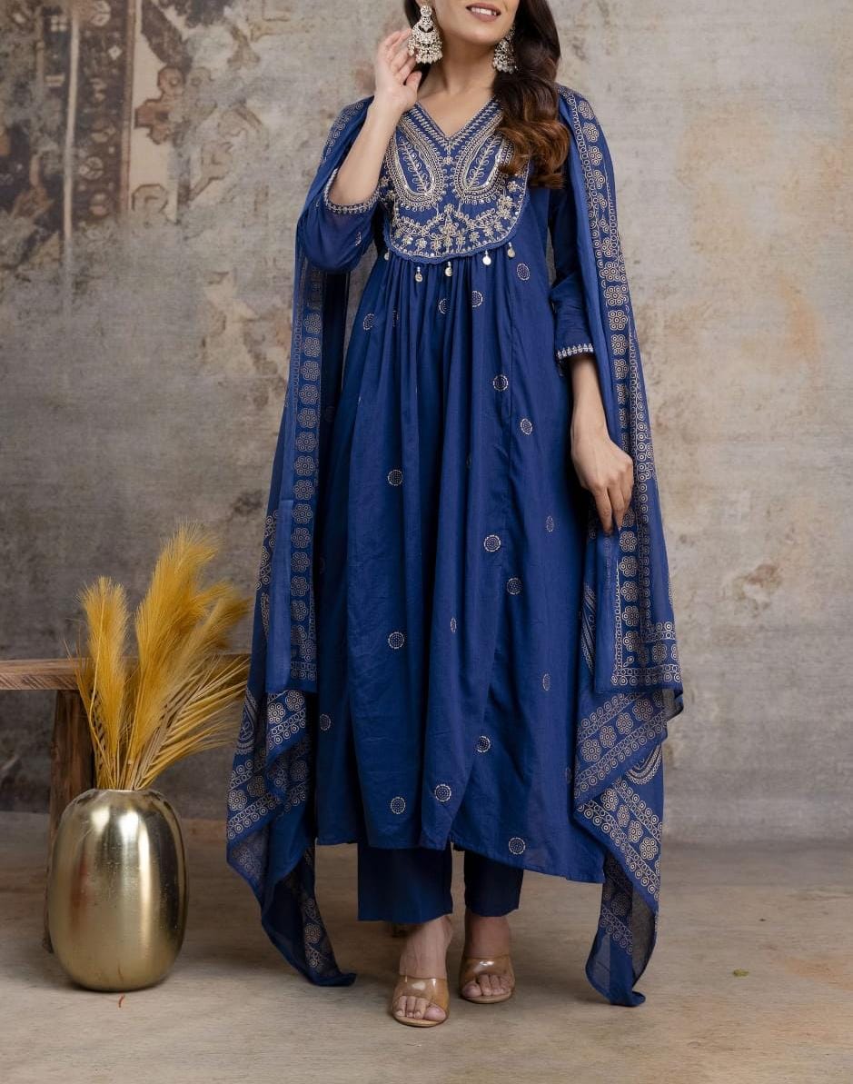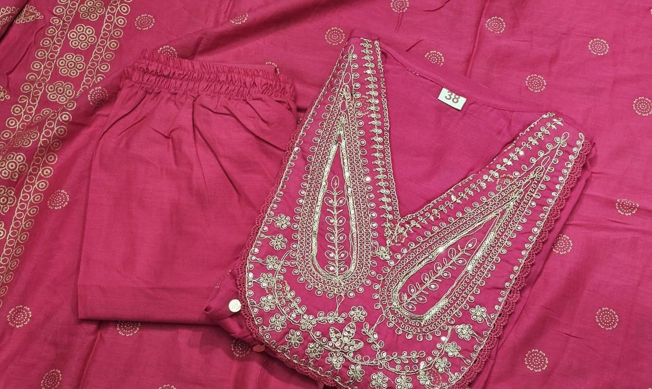 Beautiful pure mul mul cotton fabric with elegant embroidery and sequin work on the Kurti, paired with cotton pants and a fully printed dupatta. A perfect blend of comfort and style!
